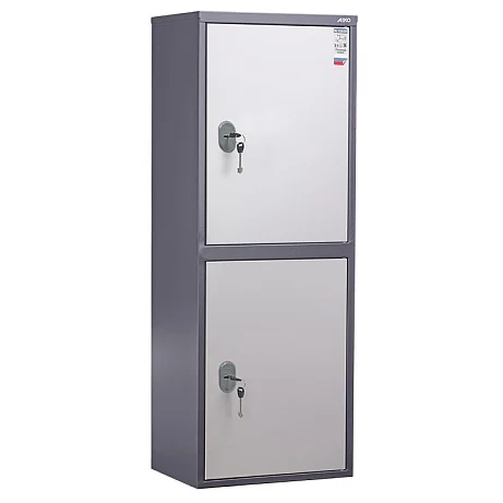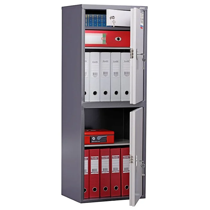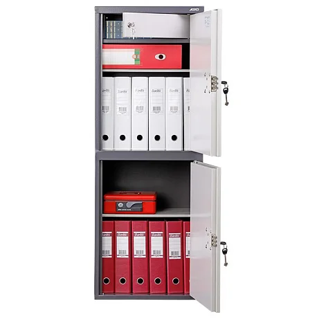 Очень удобная модель бухгалтерского шкафа с двумя отделениями. Каждое из них закрывается отдельной лицевой дверью. В каждую из дверей встроены ключевые замки. Внутри каждого отделения переставная полка. В верхней части шкафа есть отделение для банкнот и ценных бумаг, также запирающееся на ключ. Шкаф предназначен для хранения бухгалтерской документации, ценных бумаг и наличных денег. Если вы решили купить эту модель шкафа, обратитесь в магазин МедМебель, и вам быстро организуют доставку по указанному адресу.