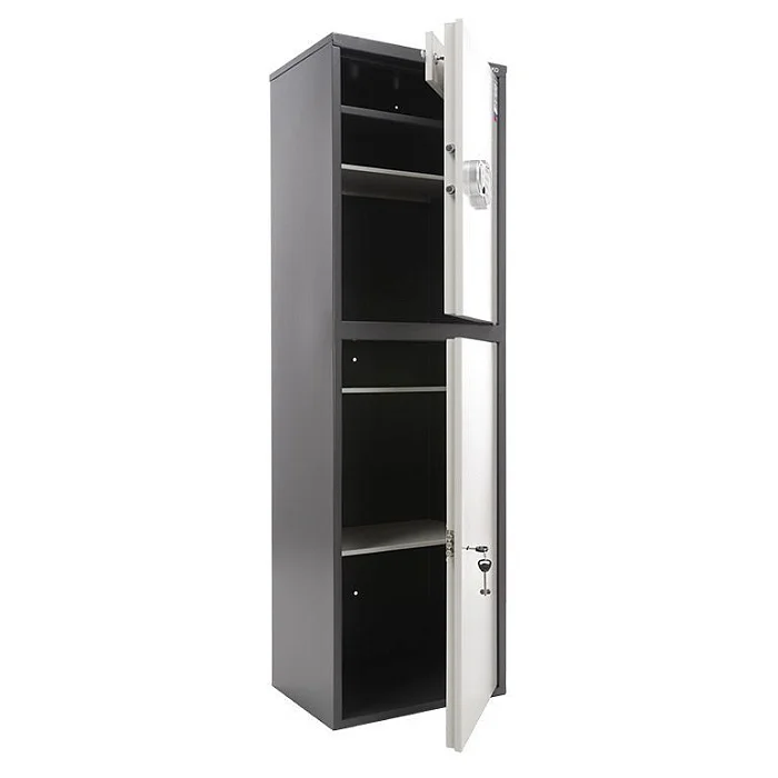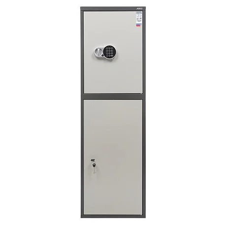 Стальной литой шкаф с двумя секциями. Верхняя секция закрывается на дверь с электронным замком PLS-1, нижняя дверь закрывается ключевым замком. Внутри шкаф очень вместительный, он оборудован переставными полками в каждой из секций. В этой модели их три штуки. Кассовое внутреннее отделение закрывается также при помощи ключа. Стальной шкаф имеет цельную конструкцию, что усложняет его доставку. Поэтому для покупки такой модели бухгалтерского шкафа следует обратиться в магазин МедМебель, где не только быстро оформят заказ, но и доставят его своими силами.