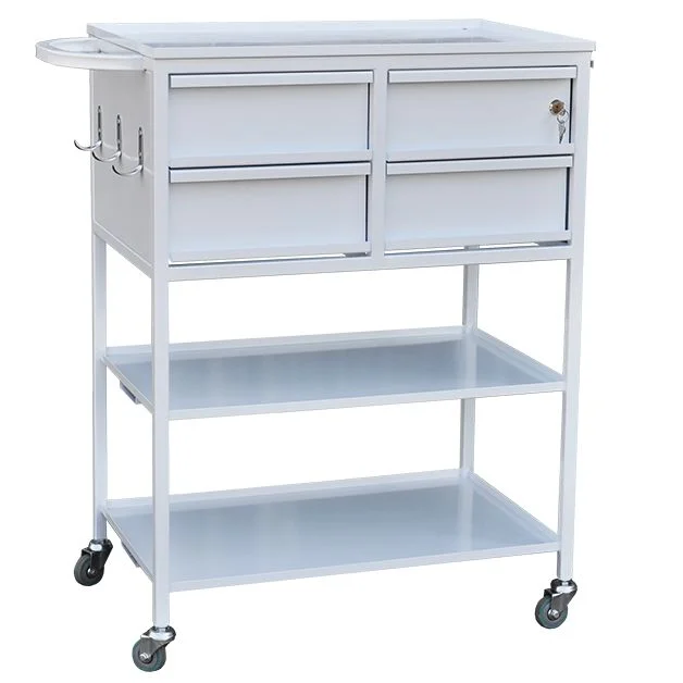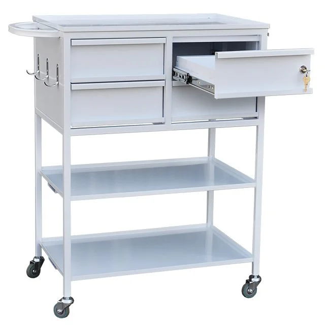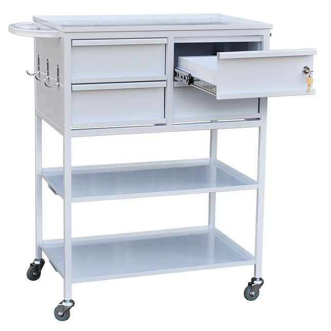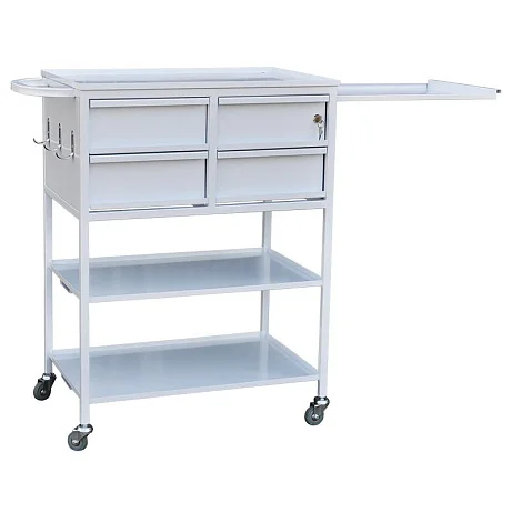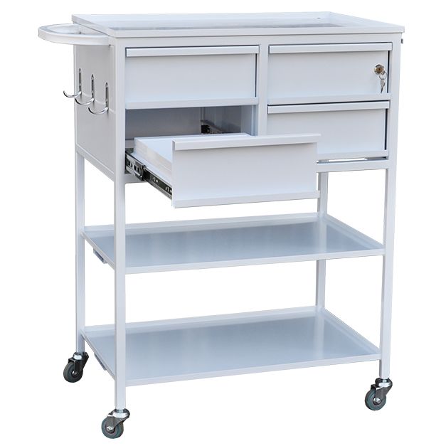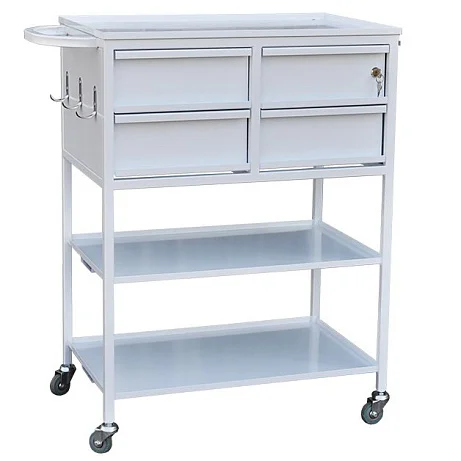 Стол-тележка для медицинских учреждений на каркасной основе из профильных труб, окрашенных порошковой краской. Три полки из нержавеющей стали, под верхней полкой находятся четыре выдвижных ящика на телескопических направляющих, один из ящиков запирается на ключ. Сбоку стола находятся три крючка, а также выдвижной лоток. Стол устанавливается на колесные опоры. Доверить доставку стола-тележки лучше специализированному московскому магазину МедМебель. Кроме того, в нем представлена мебель по умеренным ценам.