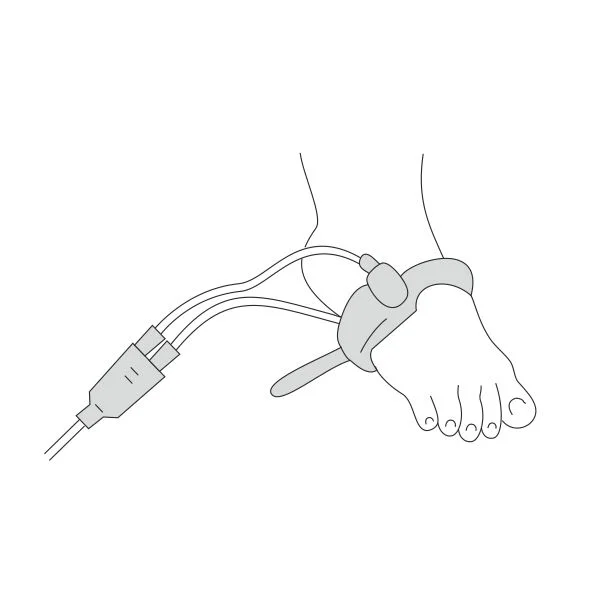 Датчик состоит из Y-бразной пары излучатель-фотоприёмник и фиксирующего ремешка. Манжета устанавливается детям и новорожденным на пальцы рук или ног, на ребро ладони и ребро ступни.