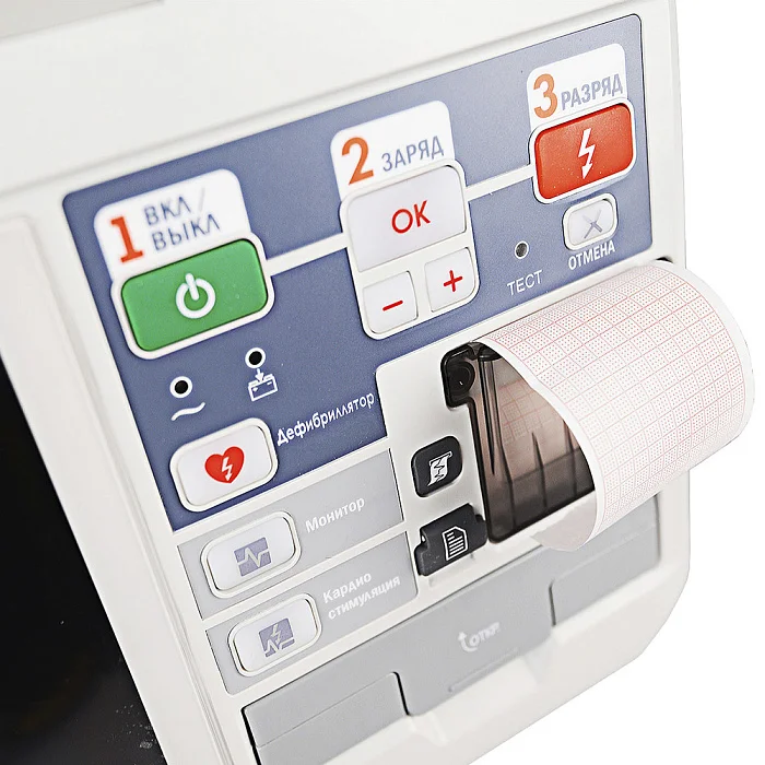 Цветной TFT-дисплей, размером — 152x91 мм с разрешением 800x480 точек и диагональю 7 дюймов, отображает настройки аппарата, ЭКГ пациента и важные жизненные показатели, которые регистрируются на бумажной ленте.