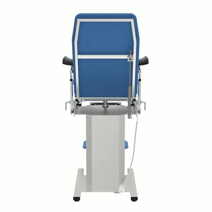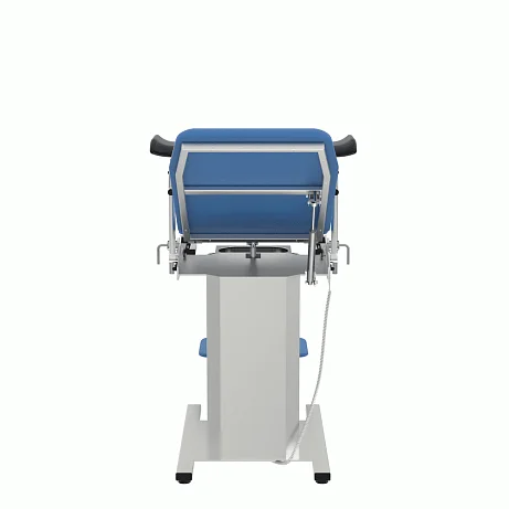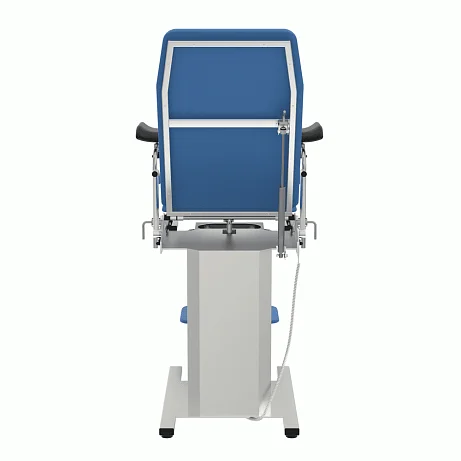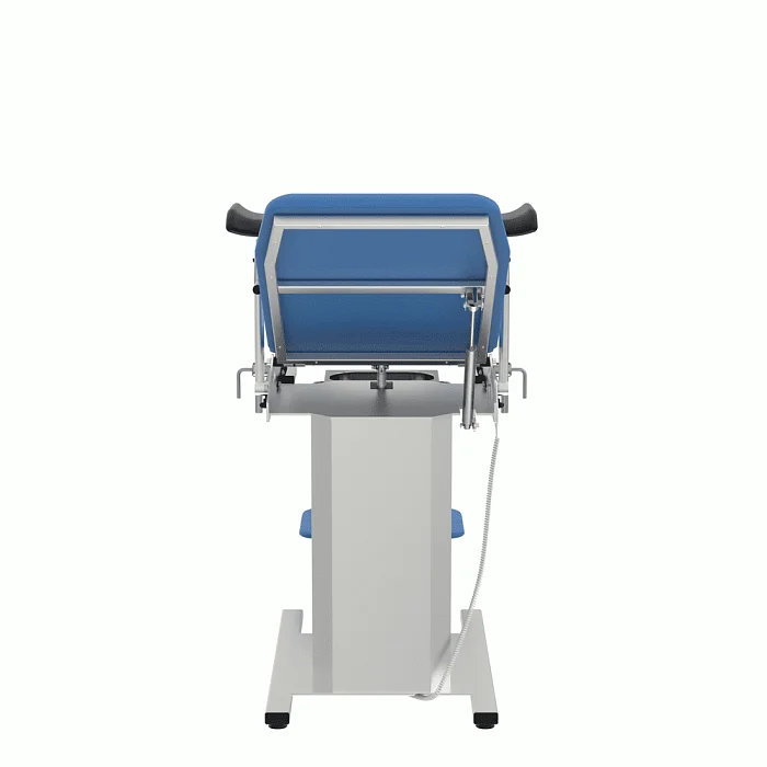 Электропривод тазовой секции управляется с пульта — врач настраивает высоту и угол тазовой зоны, не отвлекаясь от процесса. Спинка на пневмопружине регулируется одной рукой и фиксируется, включая горизонталь, независимо от положения сиденья. Подколенные упоры на винтовых зажимах легко выставить по высоте и направлению под анатомию пациента.