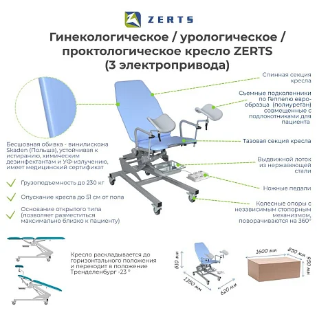 Модель ZERTS создана как универсальное гинекологическое кресло, которое одинаково уверенно работает в условиях частного медицинского центра, женской консультации, смотрового кабинета, многопрофильной клиники или стационара. Конструкция подходит для проведения всех основных видов гинекологических осмотров и манипуляций, а также может использоваться в урологии и проктологии. Благодаря электроприводной системе врач получает возможность точно и плавно изменять положение кресла без лишних усилий и пауз в работе.