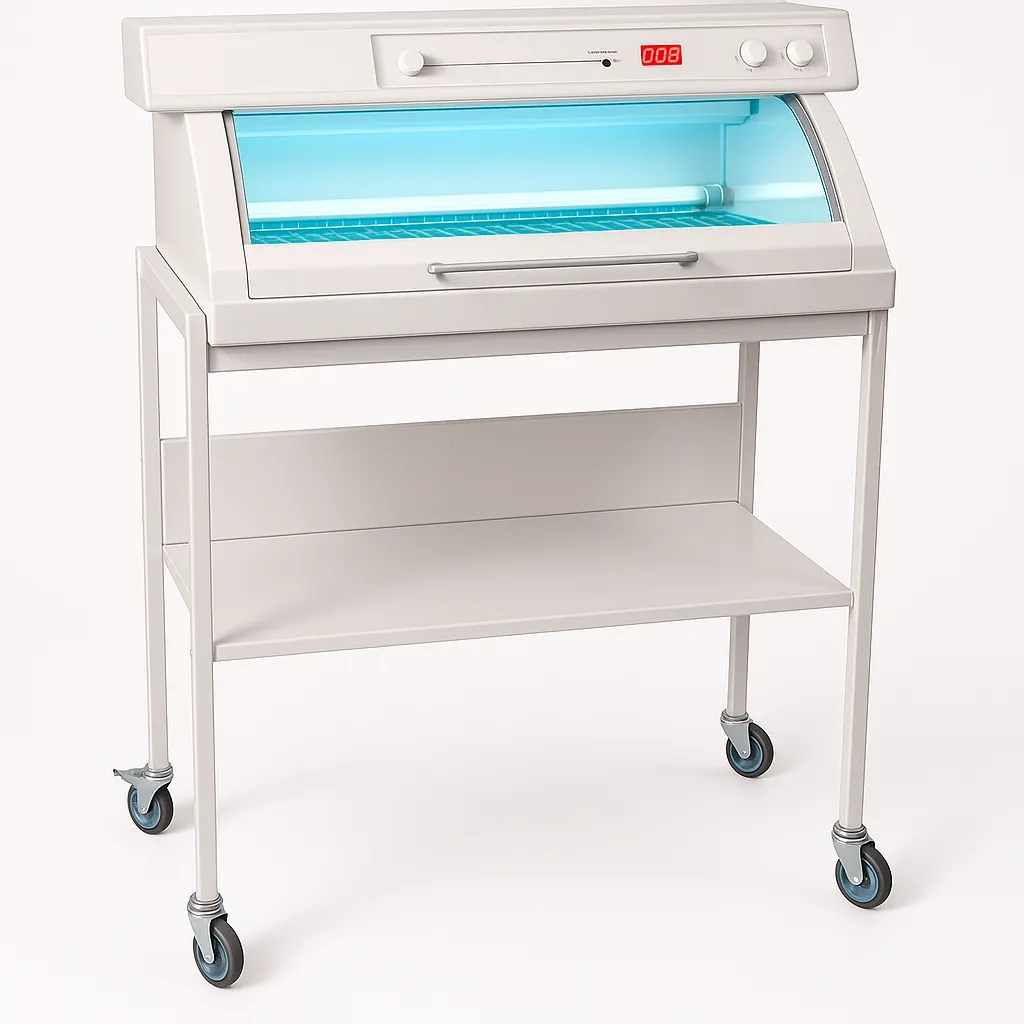 Главная фишка спрятана в том, чего не видно при беглом взгляде: цоколи и крепления УФ-лампы вынесены за пределы рабочего объема. Звучит просто, но эффект ощутимый. Внутри остается чистый объем без «мертвых» зон вокруг патронов и крепежа. Потоки излучения распределяются равномернее, а обслуживание лампы не вмешивается в стерильное пространство. В результате режимы поддержания стерильности выравниваются, а риски для инструмента снижаются без дополнительных манипуляций.