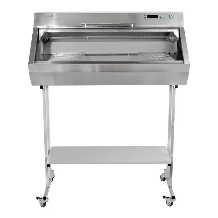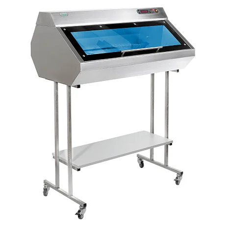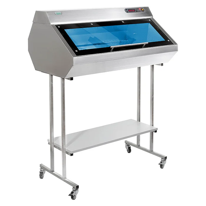корпус закреплён на тележке из нержавеющей стали, с полкой из ДСП