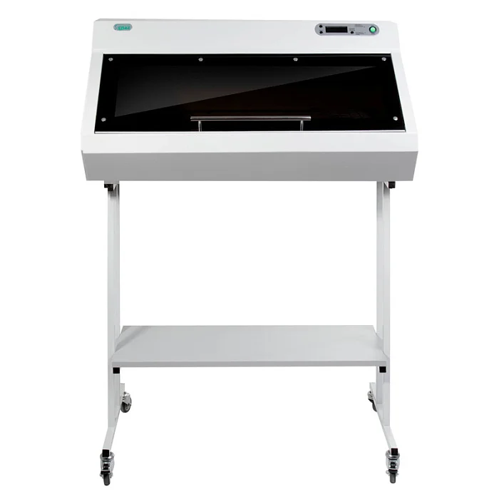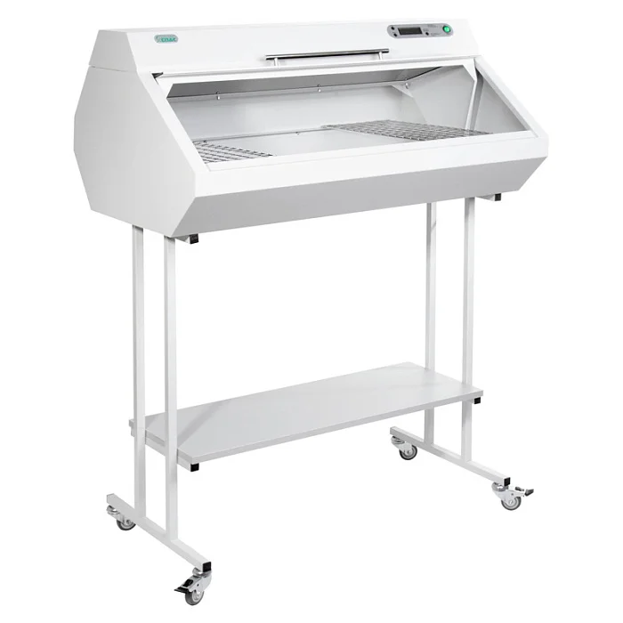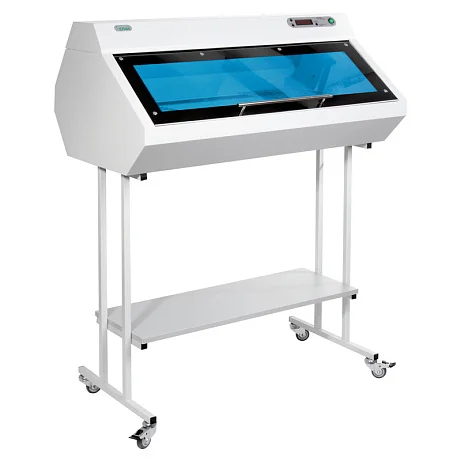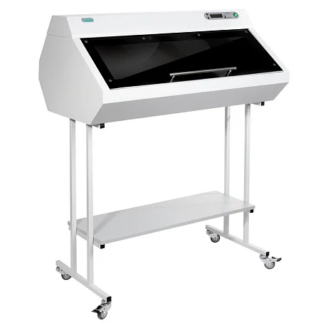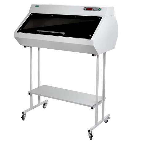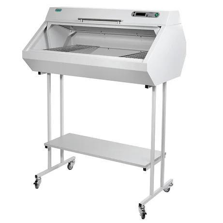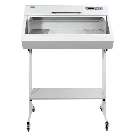 корпус закреплён на металлической тележке с полимерно-порошковым покрытием, с полкой из ДСП