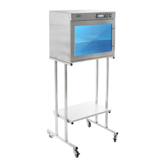 корпус закреплён на тележке из нержавеющей стали, с полкой из ДСП