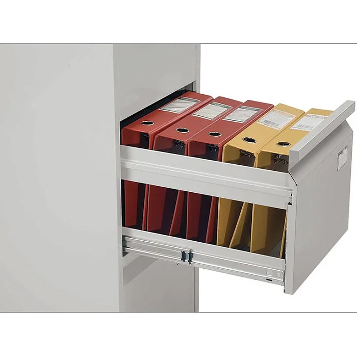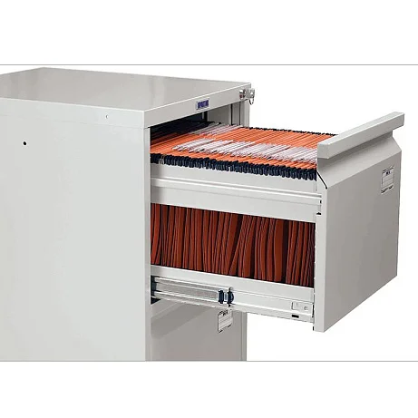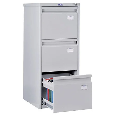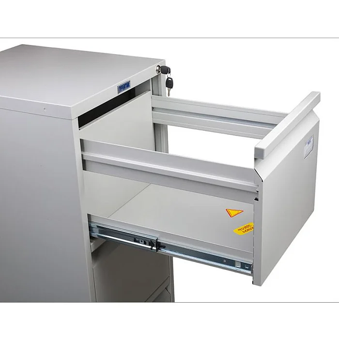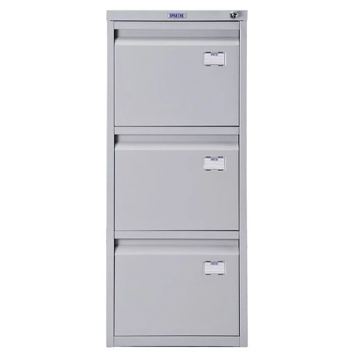 Хранение документов организовать практично и рационально поможет картотечный шкаф ПРАКТИК А-43. Его три выдвижных ящика установлены на надежные телескопические направляющие. Благодаря этому каждый переносит 50000 открываний при нагрузке до 20 кг. Ящики запираются, для этого шкаф оснащен центральным замком. В ящики помещаются документы формата А4, также их можно использовать для хранения личных вещей и офисных принадлежностей. Каждый ящик выдвигается полностью, поэтому все пространство в них можно рационально использовать. А чтобы конструкция не опрокидывалась, одновременно выдвигать можно только один ящик.