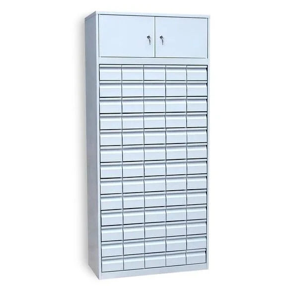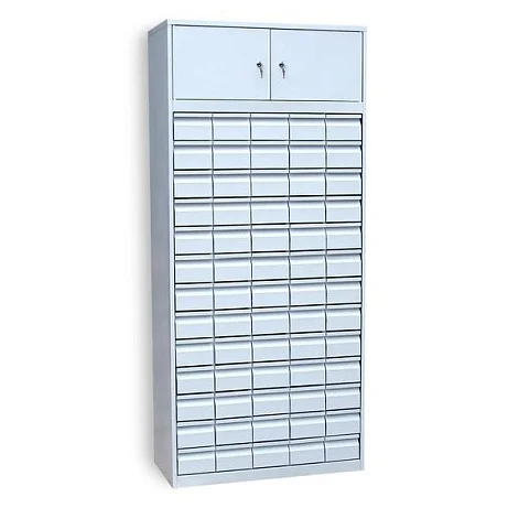Картотечный шкаф ШК-65 предназначен для хранения большого объема карточек. Для этого в нем предусмотрено 65 выдвижных ящиков на роликовых направляющих. Они расположены по 5 в ряд на 13 уровнях. Максимальная допустимая нагрузка на каждый ящик — 5 кг. Верхнее отделение шкафа — это две секции, которые закрываются на отдельные дверцы с ключевым замком каждая. В этой части внутреннего пространства конструкции можно будет хранить объемные папки с документами, справочники и т. д.