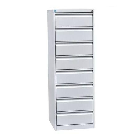 Шкаф картотечный ШК-8 формат А5 предназначен для хранения в удобных условиях документов соответствующего размера. Внутреннее пространство каждого из восьми выдвижных ящиков разделено стационарной поперечной перегородкой. Каждый ящик выдерживает нагрузку до 15 кг и выдвигается полностью благодаря системе телескопических направляющих. Все ящики запираются одним центральным замком, но конструкция предусматривает возможность оснащения каждого из них отдельным замком по желанию заказчика.