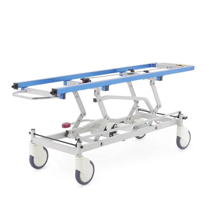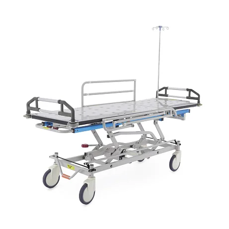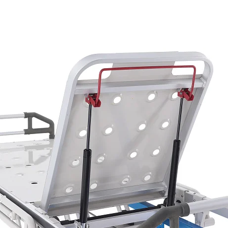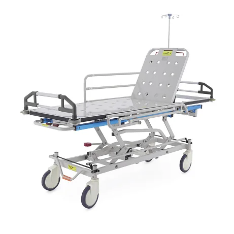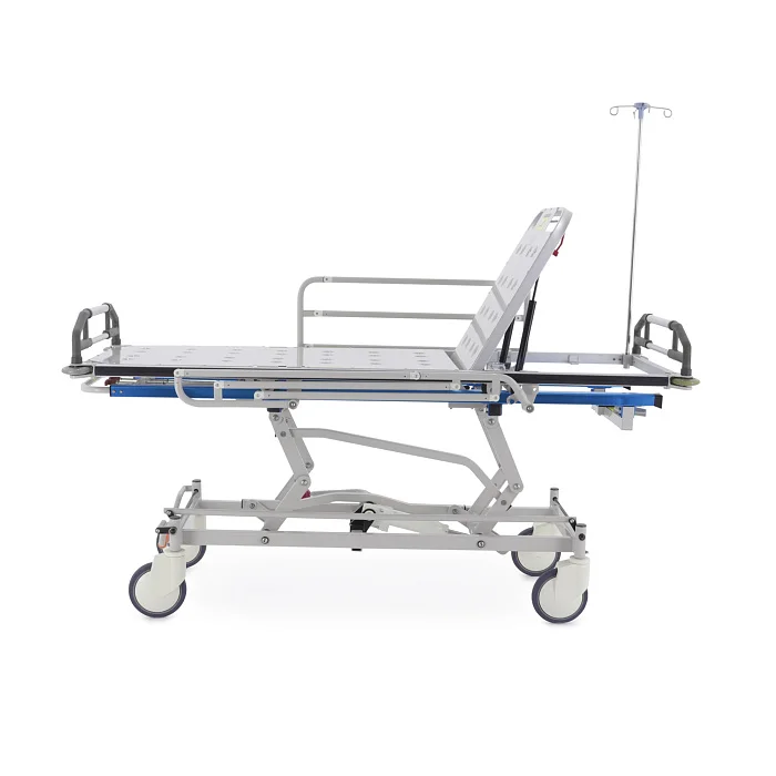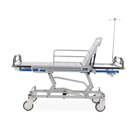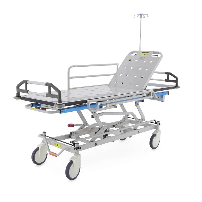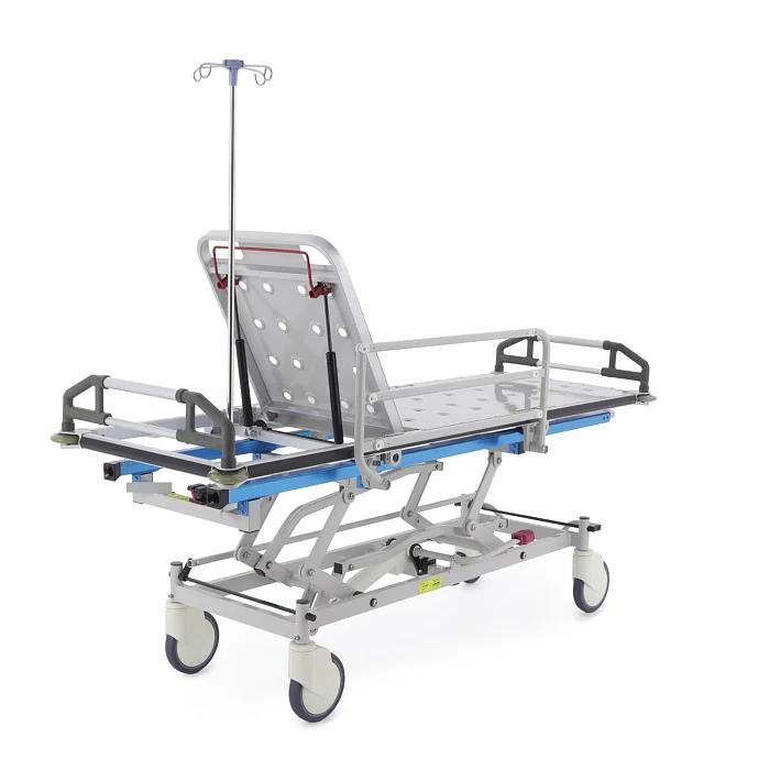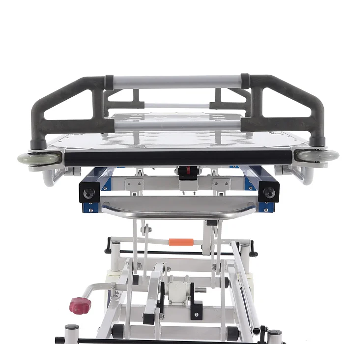 При транспортировке пациента большое значение имеют не только прочность конструкции, но и плавность регулировок. В этой модели подъем и опускание выполняются гидроцилиндрами с педалью управления, поэтому персонал может быстро подстроить высоту под конкретную задачу: перегрузку, перемещение, ожидание перед процедурой или передачу в другое отделение. Регулируемая спинная секция делает положение пациента более физиологичным и комфортным, что особенно важно после операций, при ослабленном состоянии или в процессе длительного перемещения по территории клиники.