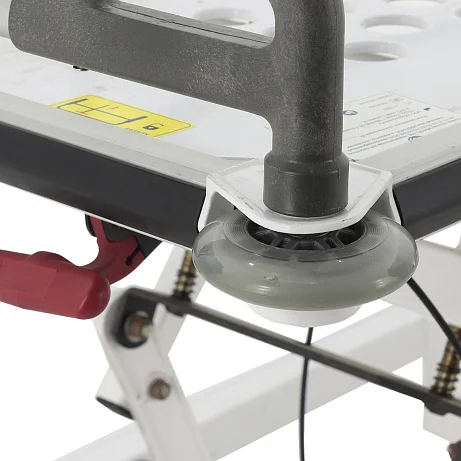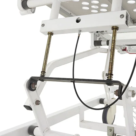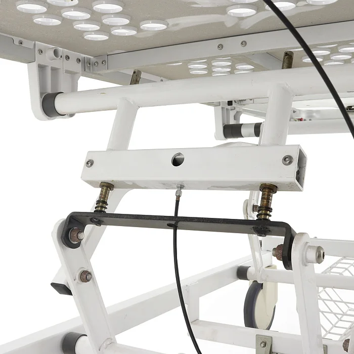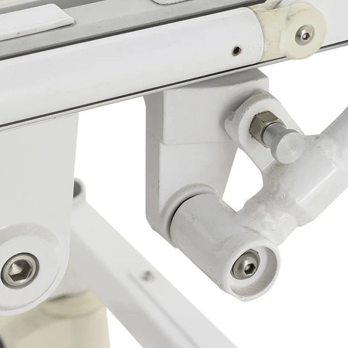 Модель оснащена двойной подвижной рамой из высокопрочного стального и алюминиевого профиля и труб. Такое сочетание материалов обеспечивает хороший баланс между жёсткостью, устойчивостью и долговечностью. Полимерно-порошковое покрытие защищает металлические элементы от износа и упрощает санитарную обработку, что особенно важно для медицинских учреждений, где оборудование регулярно подвергается дезинфекции.