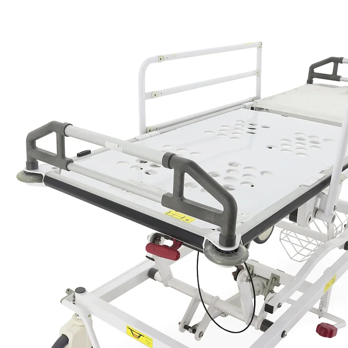 Складные несъёмные боковые поручни обеспечивают защиту пациента во время движения и при изменении положения ложа. Головной и ножной транспортировочные поручни помогают персоналу уверенно управлять каталкой при перевозке в ограниченном пространстве, в лифтах и узких коридорах. Для дополнительной защиты мебели, дверных проёмов и стен предусмотрены противоударные пластиковые накладки и четыре роликовых бампера из полиуретана.