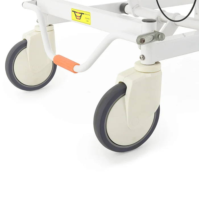 Тележка оснащена одинарными самоориентирующимися колёсами диаметром 200 мм с полиуретановыми шинами. Они обеспечивают плавный ход, уверенное движение по типовым покрытиям медицинских учреждений и хорошую управляемость при поворотах на 360°. Центральный тормоз с ножным рычагом управления сразу всеми колёсами помогает быстро зафиксировать каталку в нужной точке без лишних действий. Это особенно удобно при приёме пациента, во время осмотра, при подготовке к процедурам и при пересадке.