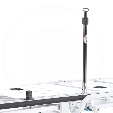 Складная несъемная инфузионная стойка удобна при транспортировке пациентов, которым требуется постоянная инфузионная поддержка. Ниша для кислородного баллона с пластиковой накладкой на нижней раме делает перемещение более организованным и безопасным. Головной и ножной транспортировочные поручни добавляют удобства при управлении каталкой и помогают персоналу уверенно контролировать движение.