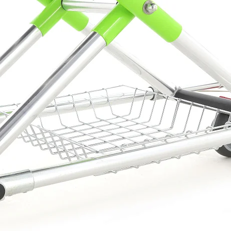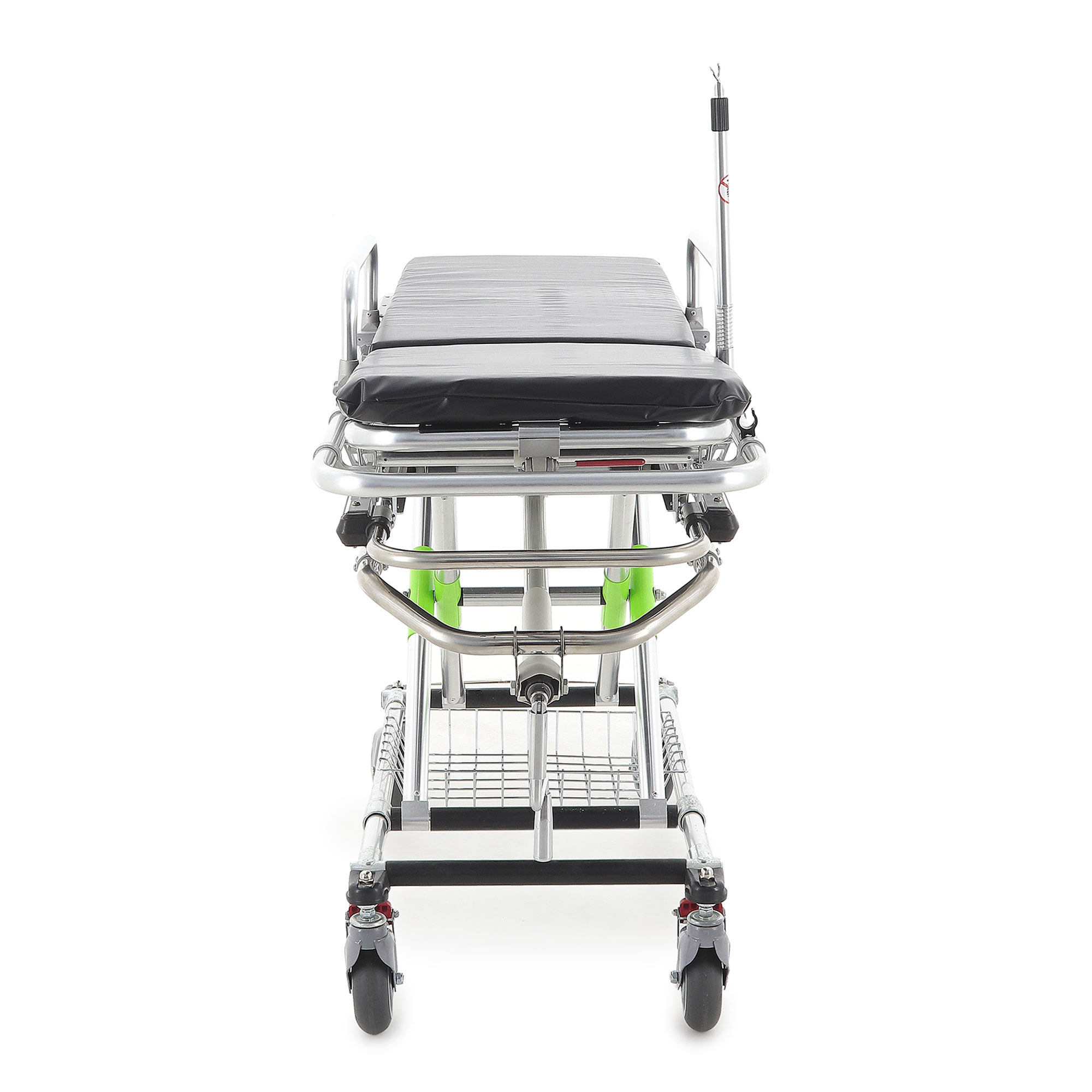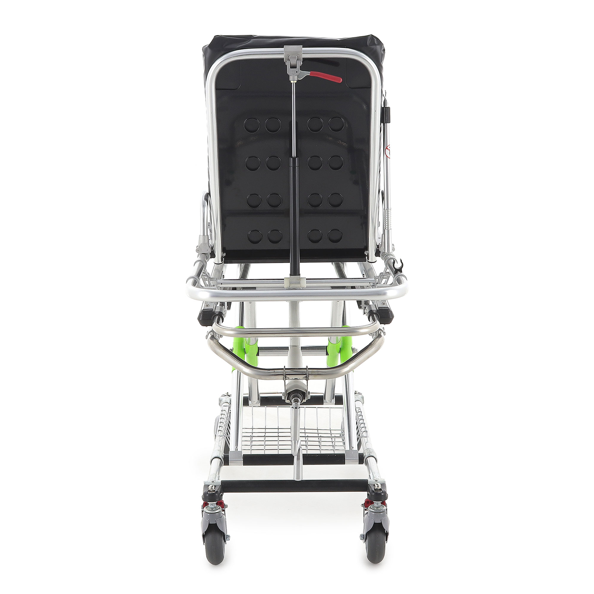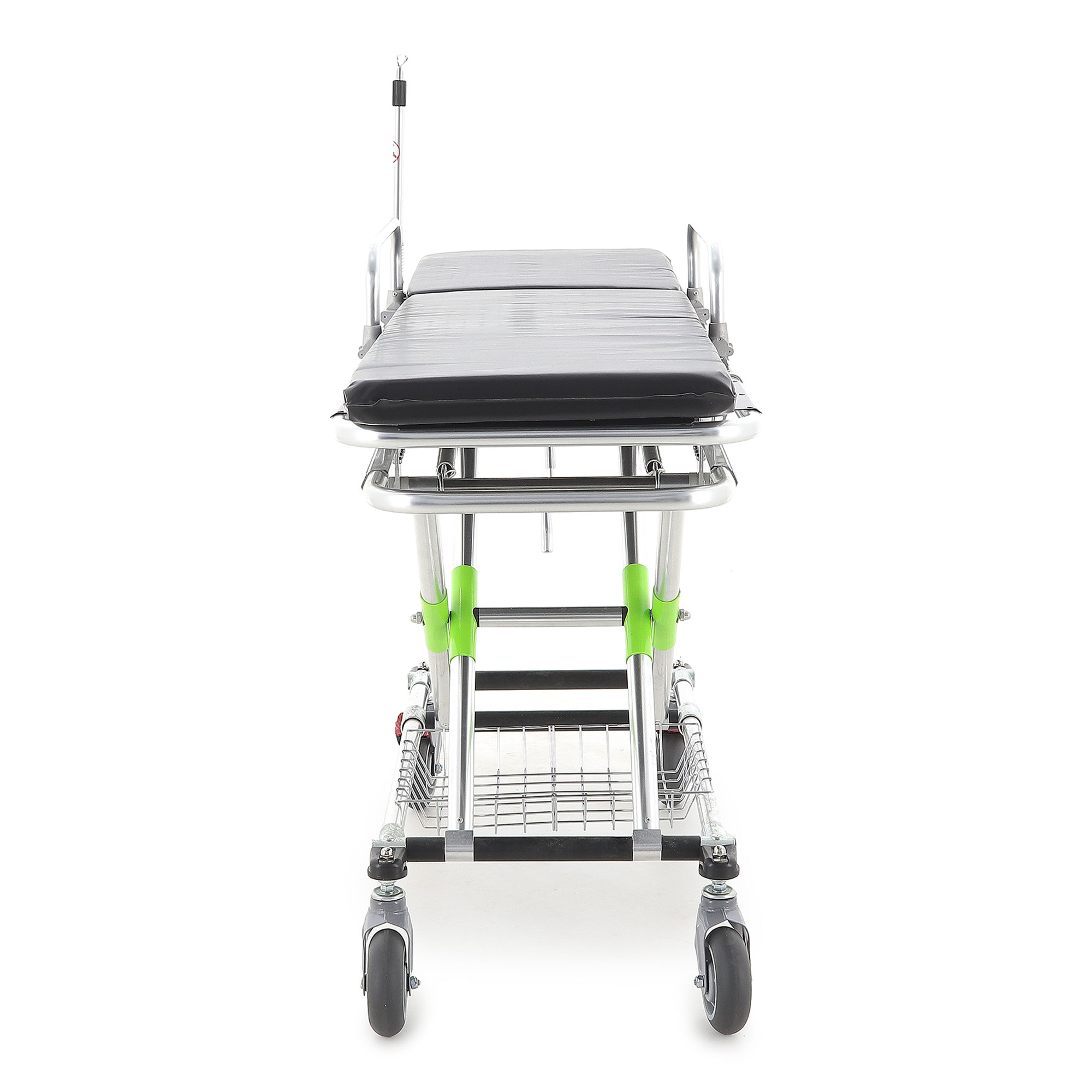 Основа каталки — двойная рама из высокопрочного алюминиевого профиля. Такое решение даёт два ощутимых плюса в реальной эксплуатации: каталку проще разгонять и разворачивать в узких коридорах, а при этом сохраняется достойный запас прочности для ежедневных перевозок. На нижней раме размещена корзина для белья, которая помогает держать расходные материалы или сменные принадлежности «под рукой», не загромождая проходы тележками и пакетами.