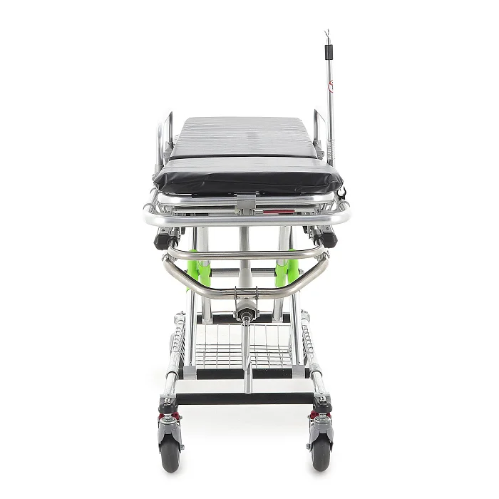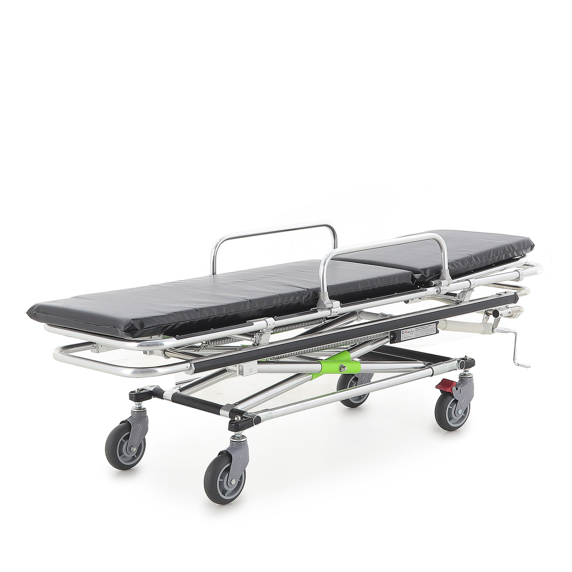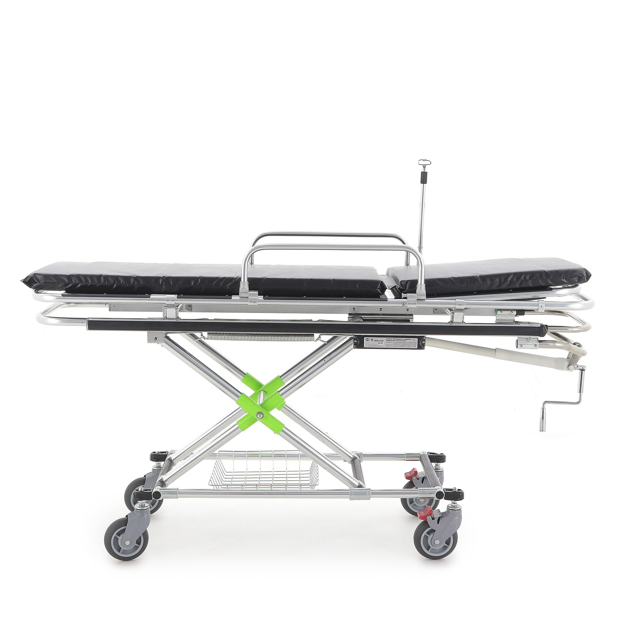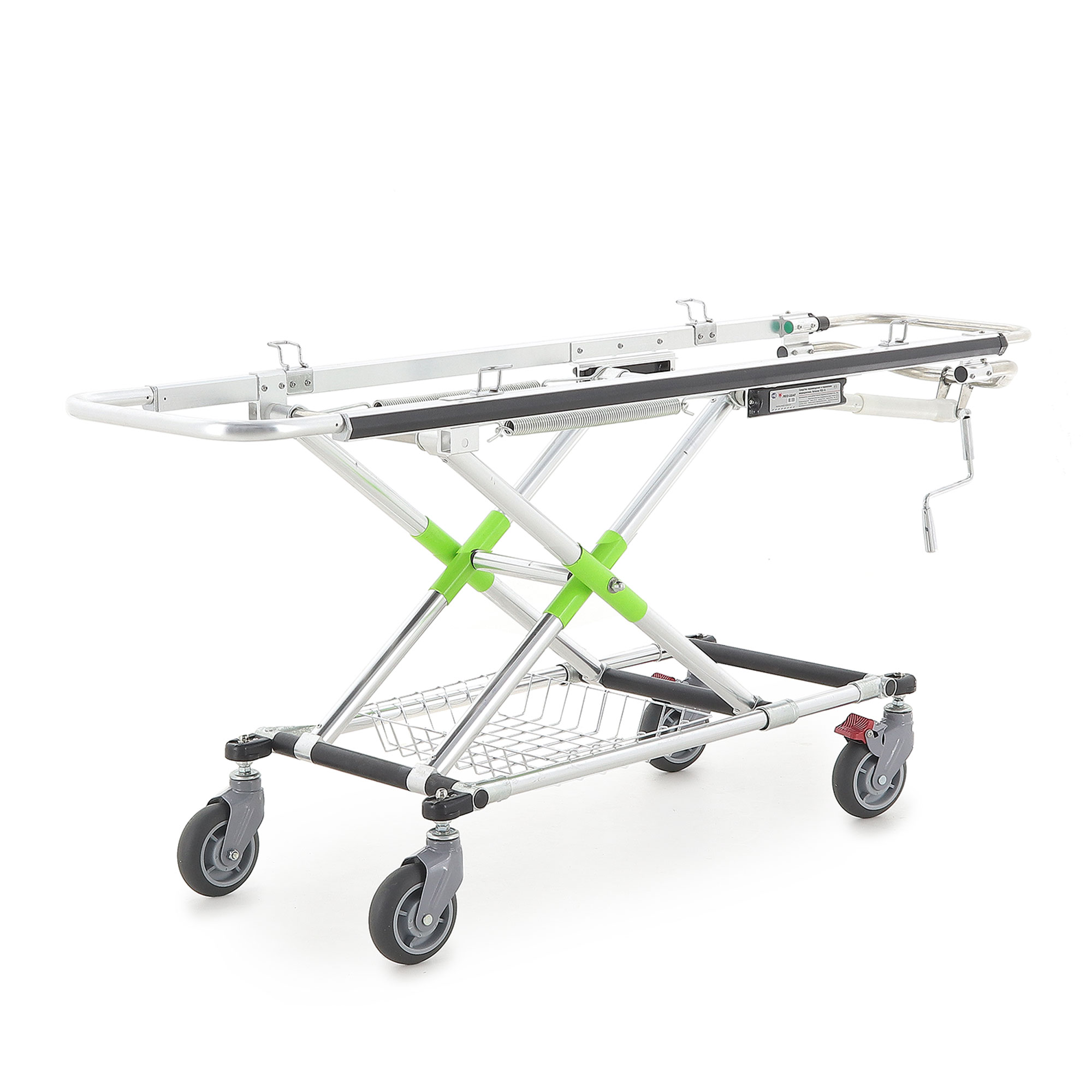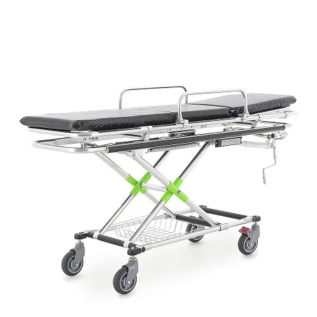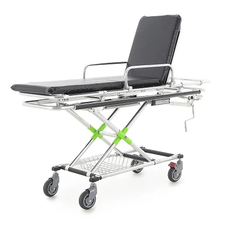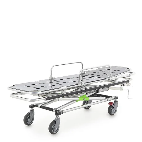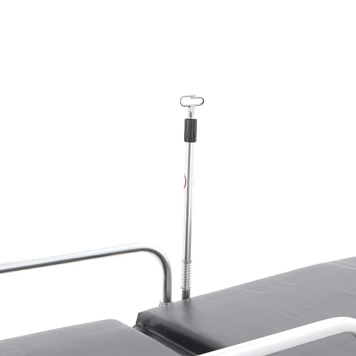 Подъём/опускание реализованы через механический винтовой привод линейного перемещения. В конструкции предусмотрены две мощные пружины, компенсирующие нагрузку при подъёме каталки с пациентом — рукоять вращается заметно легче, чем у простых механических систем. Рукоять хромированная и складная: удобно, когда важна компактность и ничего не должно цепляться в проходах.
