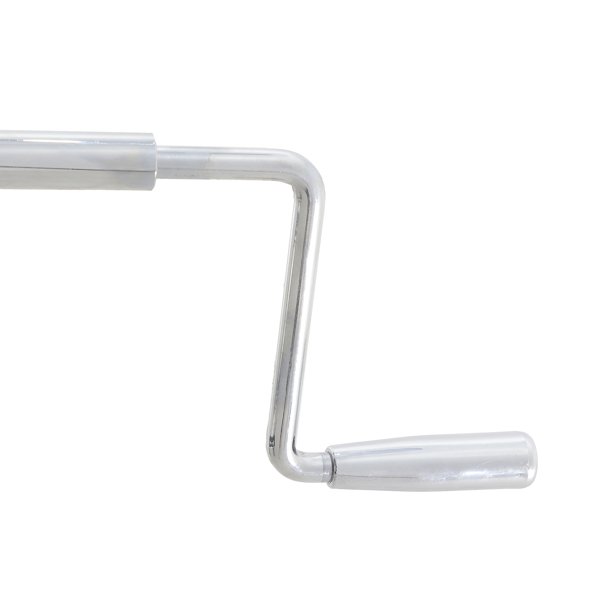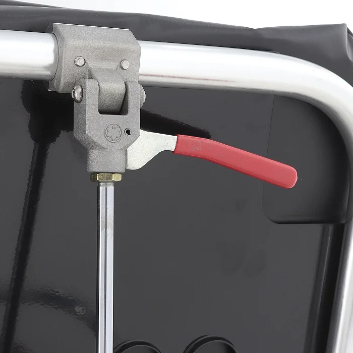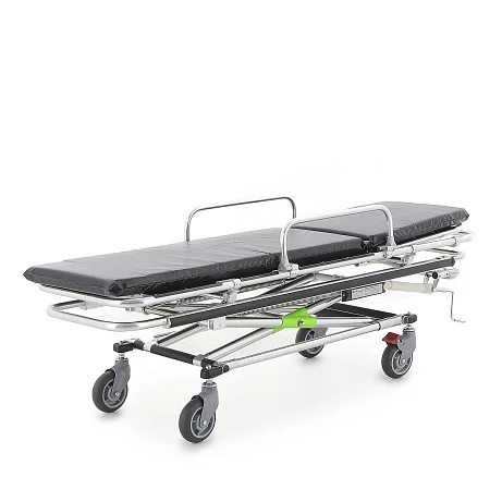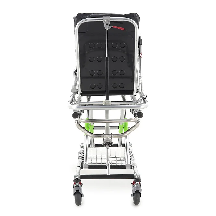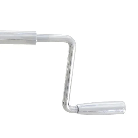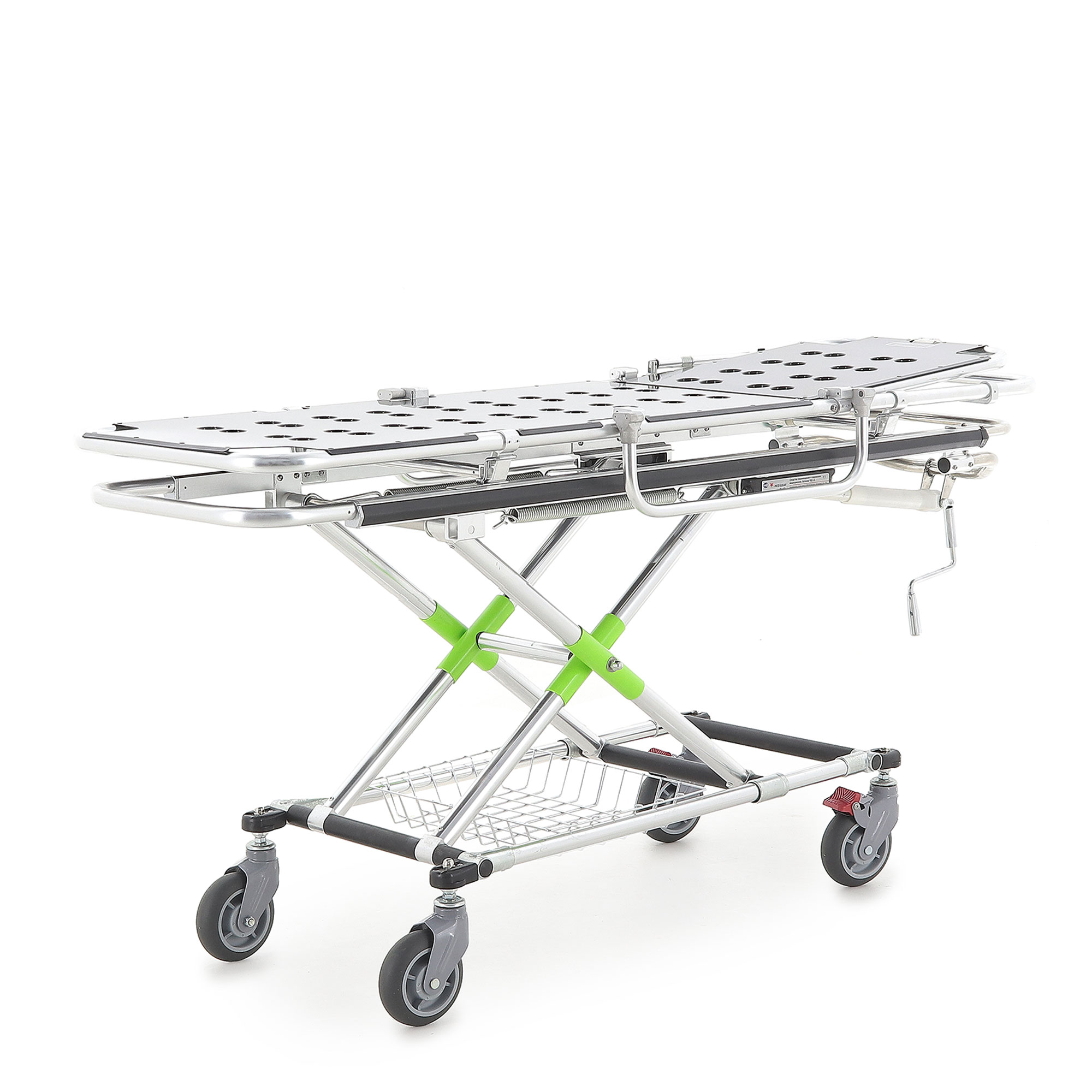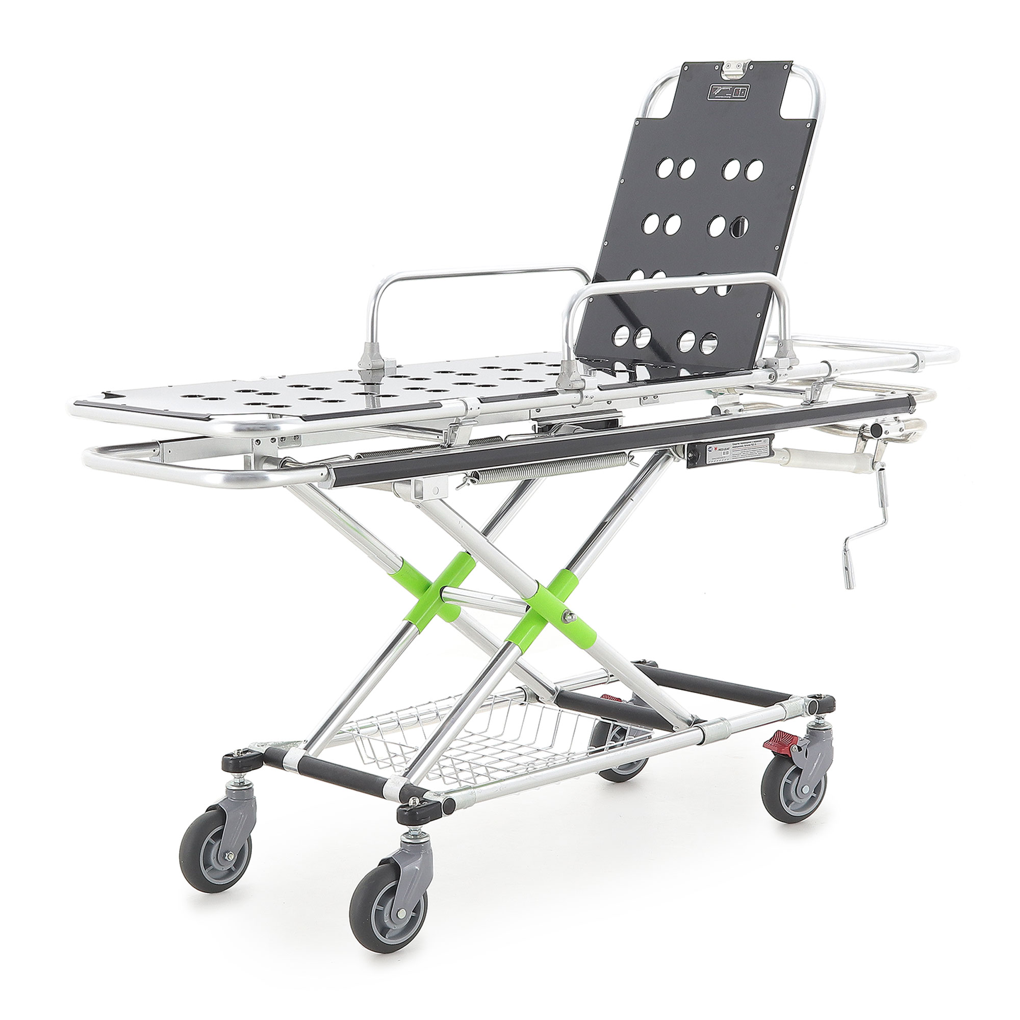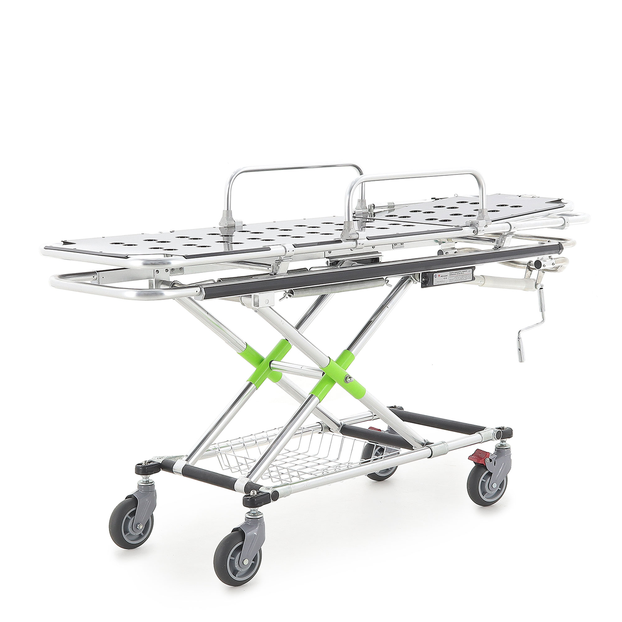 Подъём/опускание реализованы через механический винтовой привод линейного перемещения. В конструкции предусмотрены две мощные пружины, компенсирующие нагрузку при подъёме каталки с пациентом — рукоять вращается заметно легче, чем у простых механических систем. Рукоять хромированная и складная: удобно, когда важна компактность и ничего не должно цепляться в проходах.