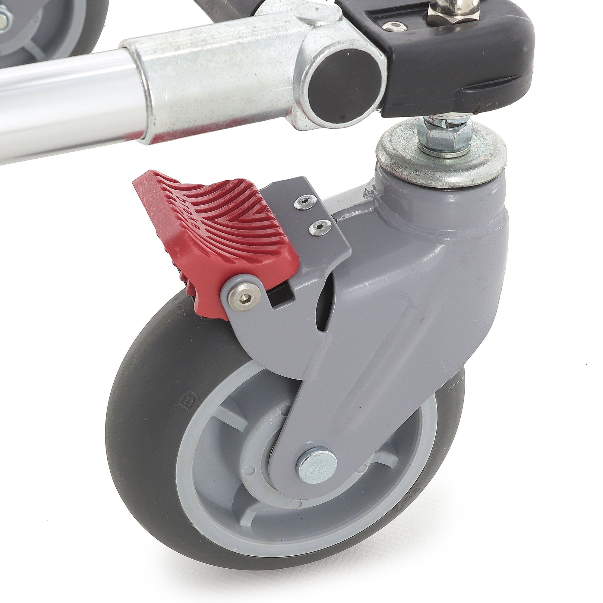 Каталка оснащена полиуретановыми самоориентирующимися колёсами Ø150×48 мм с поворотом на 360°. Такой тип колёс обычно выбирают за мягкий ход и устойчивость к интенсивной эксплуатации в коридорах и лифтах. На задней паре предусмотрены индивидуальные тормоза — удобно фиксировать положение при посадке/перекладывании и во время коротких остановок.