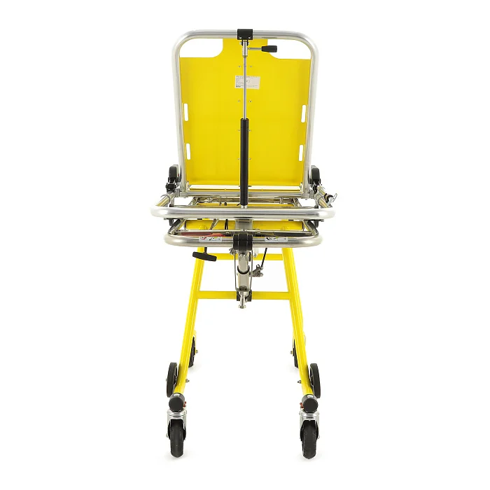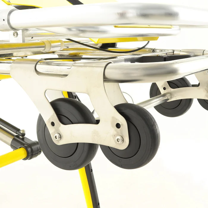 Модель оснащена продуманной колесной базой, адаптированной под задачи скорой медицинской помощи. Колеса выполнены из высокопрочного пластика и литой резины, что обеспечивает хороший баланс между износостойкостью, плавностью хода и устойчивостью. Задняя пара загрузочных колес имеет размер 99×31 мм, основная передняя пара — 123×31 мм, а накатывающая передняя пара — 125×24 мм. Такая схема облегчает движение каталки при загрузке в автомобиль и делает процесс более контролируемым.