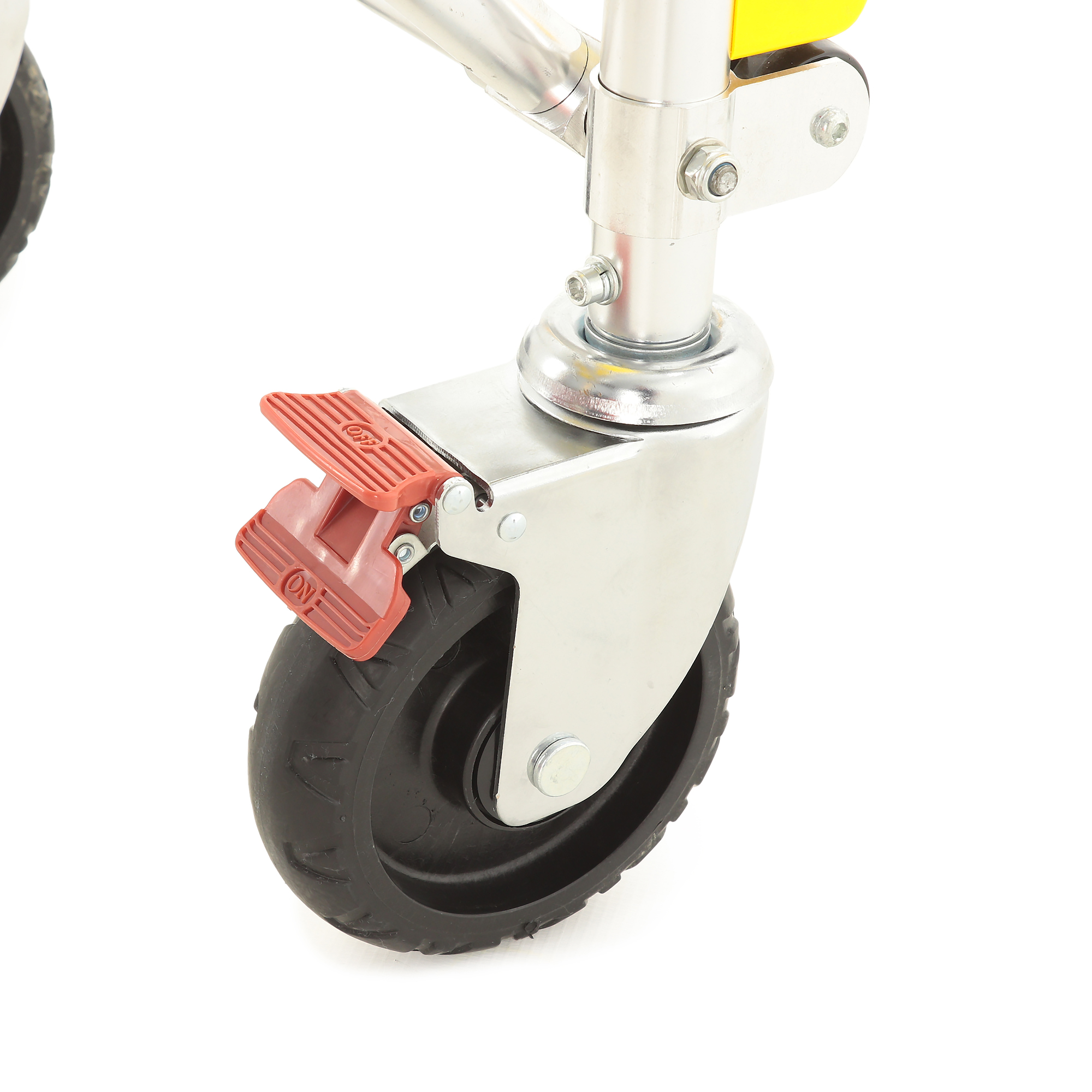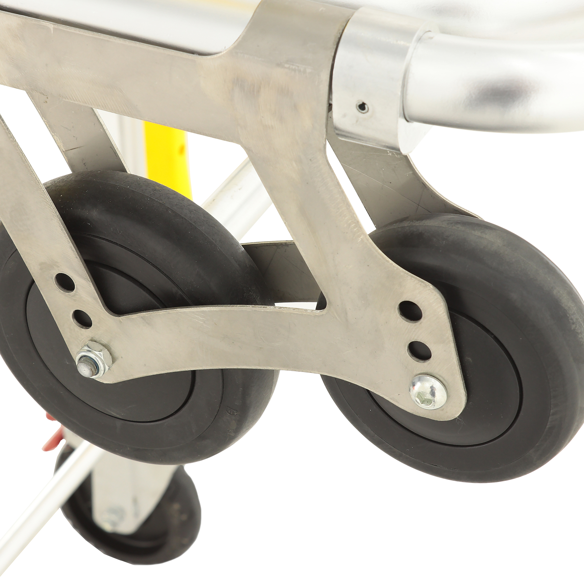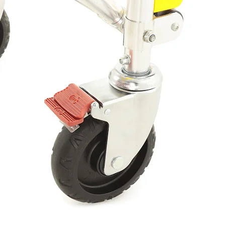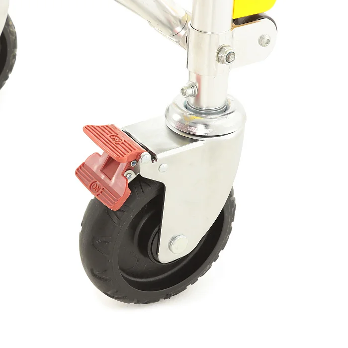 Каталка рассчитана на динамичную работу: разные типы колес и опор помогают сохранять стабильность при движении по неровным покрытиям и при загрузке в автомобиль. Передняя пара оснащена индивидуальными тормозами — это удобно, когда нужно зафиксировать положение на пандусе или при остановке для манипуляций. Отдельно стоит отметить магнитную ориентацию задних колес: она помогает «держать курс» и делает движение более предсказуемым в узких пространствах.