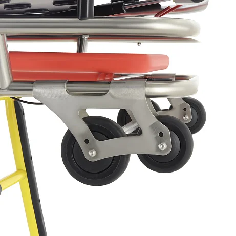 Задняя пара опорных колес оснащена индивидуальными тормозами, что особенно важно при остановке на уклоне, во время погрузки пациента и при проведении медицинских манипуляций. Такая система делает работу более контролируемой и помогает избежать случайного смещения каталки.