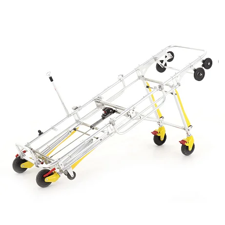 Каркас выполнен из алюминия, а рама — двойная, из высокопрочного алюминиевого профиля. Такой подход особенно ценят службы АСМП: при реальной нагрузке важна не «бумажная» прочность, а устойчивость геометрии и понятное поведение каталки при манёврах. Автоматическая фиксация складывающихся опор при установке ножек в вертикальное положение снижает риск ошибок в спешке и повышает повторяемость действий у разных сотрудников.