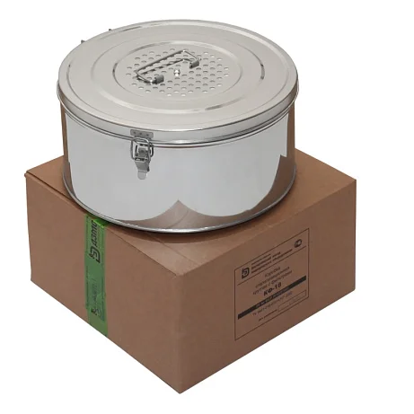 Коробка стерилизационная ДЗМО КФ-18 круглая, изготовлена она из нержавеющей стали. Предназначена для хранения медицинского инструмента, стерилизации его под паром и доставки к месту использования. Комплектацией предусмотрено наличие сменных хлопчатобумажных фильтров. Они размещаются на дне и на крышке коробки. Объем коробки – 18 л.