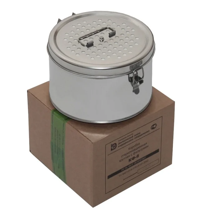 Коробка стерилизационная ДЗМО КФ-6 круглой формы изготовлена из нержавеющей стали, используется в лабораториях, поликлиниках и больницах. В такой коробке объемом 6 литров можно хранить или транспортировать различный медицинский инструмент, а также стерилизовать его в паровом стерилизаторе.
