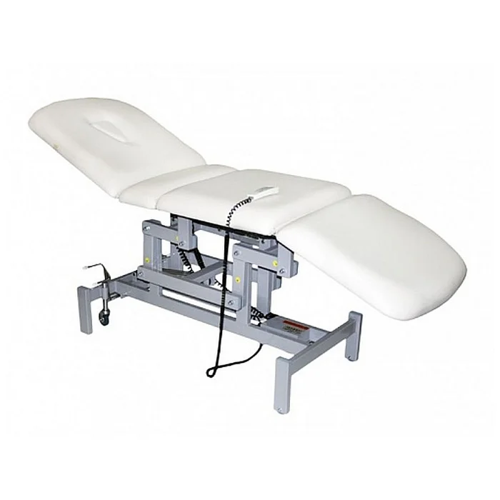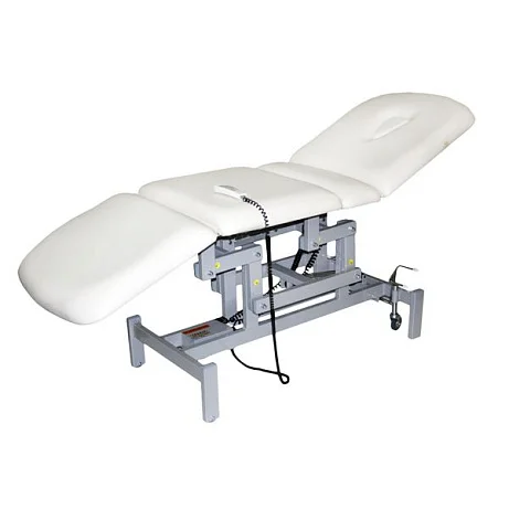 Кушетка процедурная ОДК-4 ("Ондеви-4") с проводным пультом управления. Кушетка оснащена отверстием для лица. Возможность прогиба подколенной части кушетки при помощи электропривода. Для удобства перемещения кушетка оснащена колесиками. Для большей устойчивости при процедуре массажа, колесная пара поднимается и кушетка устойчиво становится на ножки. Основание кушетки покрашено порошковой краской (цвет по каталогу RAL). Кушетка оснащена четырьмя электроприводами итальянского производства (Ciar S.p.A.), регулирующими высоту кушетки, угол наклона спинки и подножки, а также подколенную часть. Обивка выполнена из высококачественной экокожи, изготовленной в Германии (Konrad Hornschuch AG) – устойчивый к дезинфицирующим растворам износостойкий «дышащий» материал с широкой цветовой гаммой. Регистрационное удостоверение Росздравнадзора РФ № РЗН 2019/8260 от 03.04.2019. Приказ от 03.04.2019 № 2539.