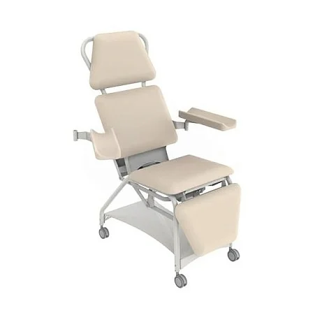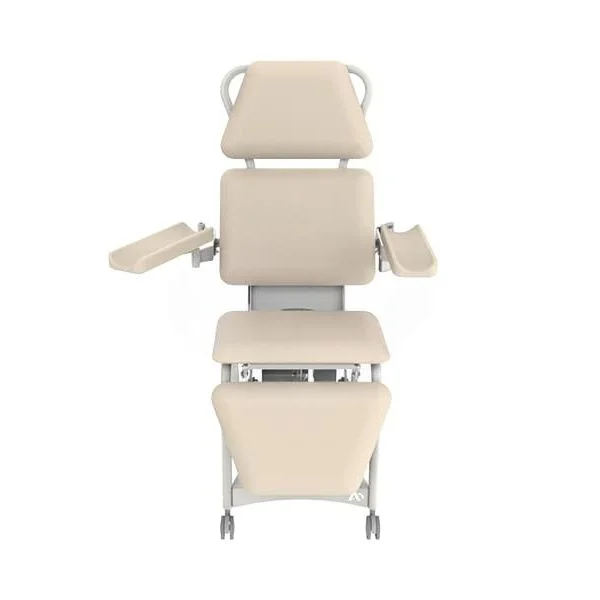 Прямоугольные подлокотники с углублением для руки фиксируются на каркасе и поворачиваются в горизонтальной плоскости. Это позволяет точно выставить положение предплечья: удобно при заборе крови, установке катетера, капельной терапии и других процедурах, где требуется уверенная опора без напряжения кисти и плечевого пояса.