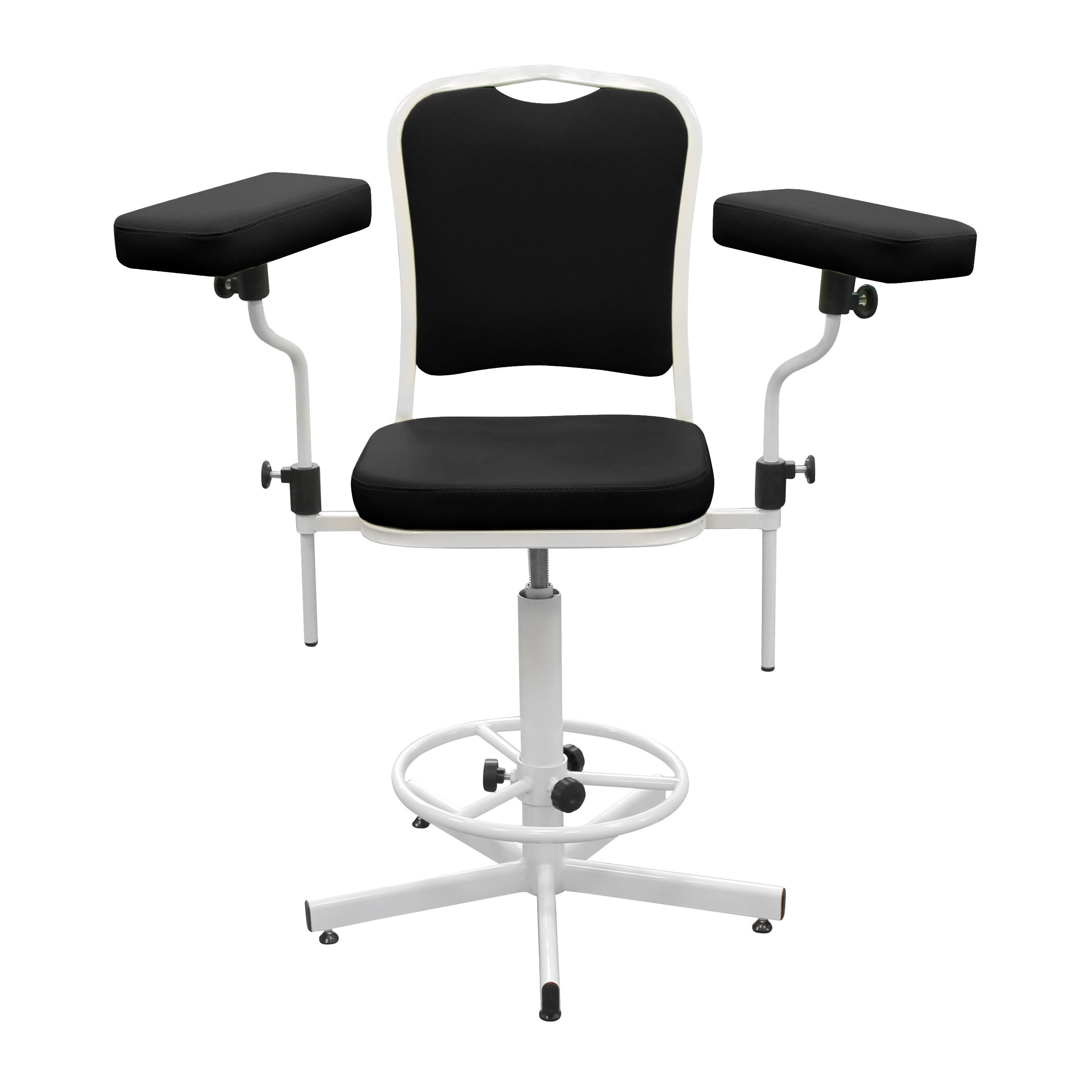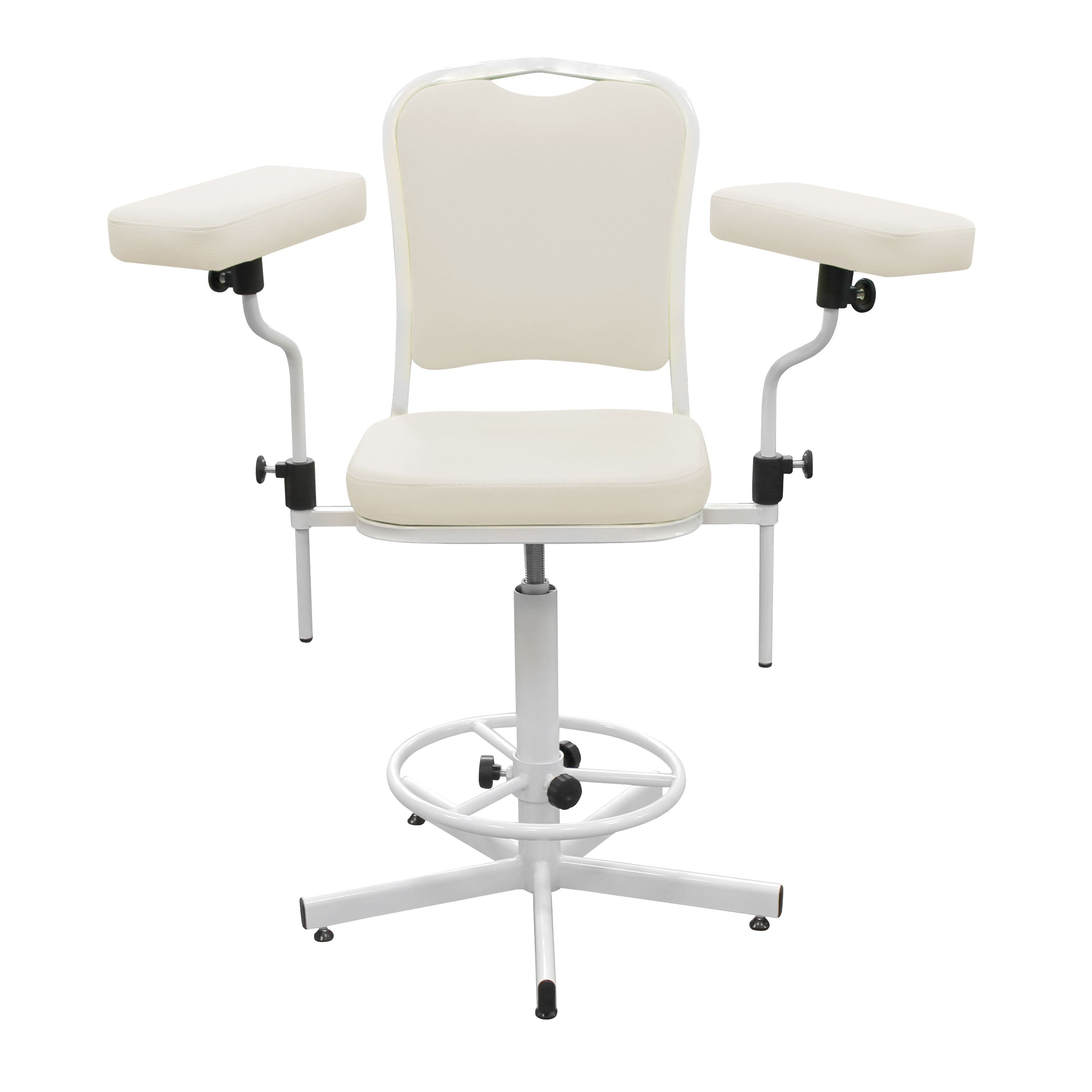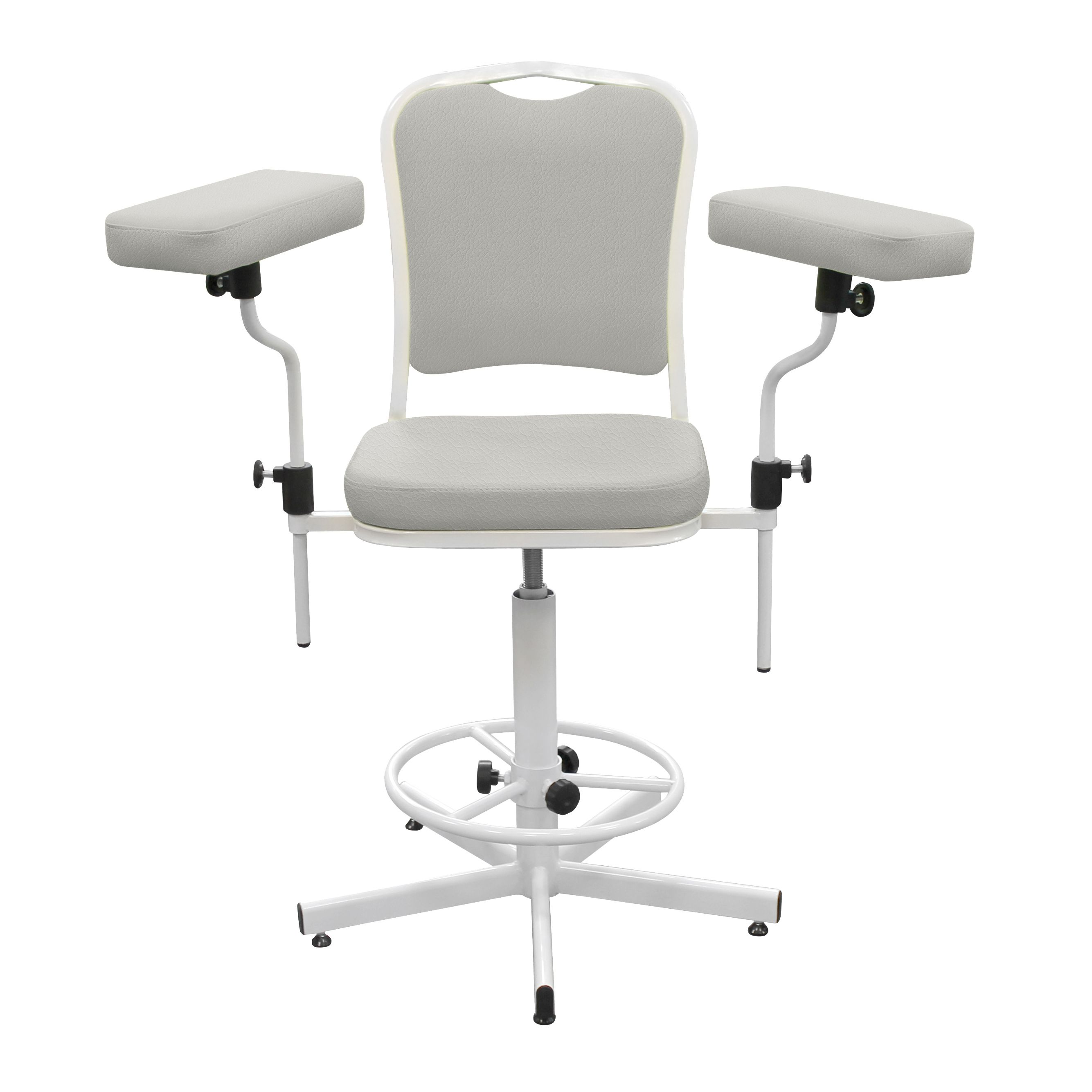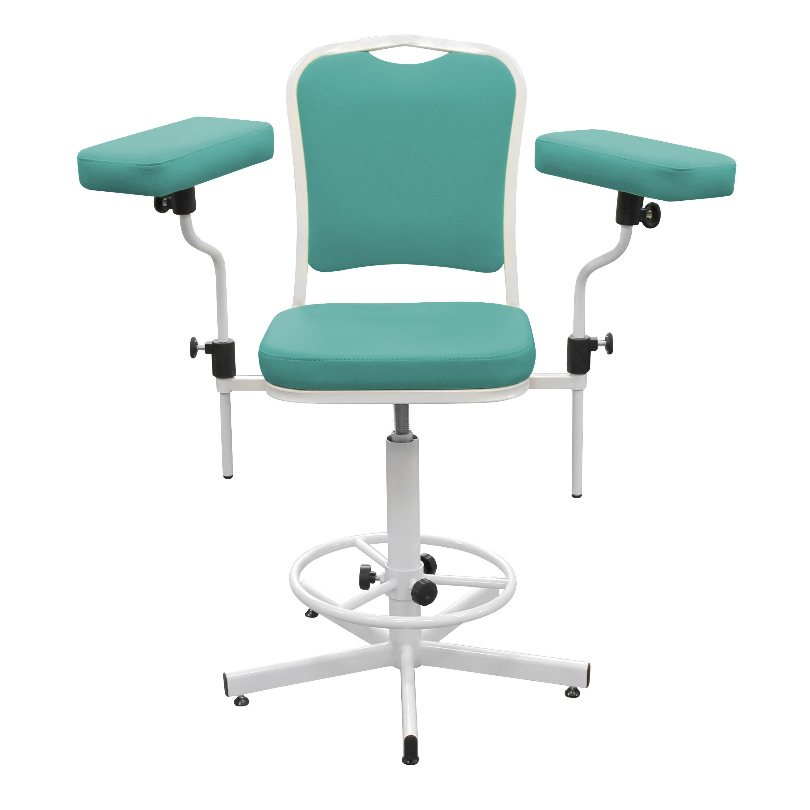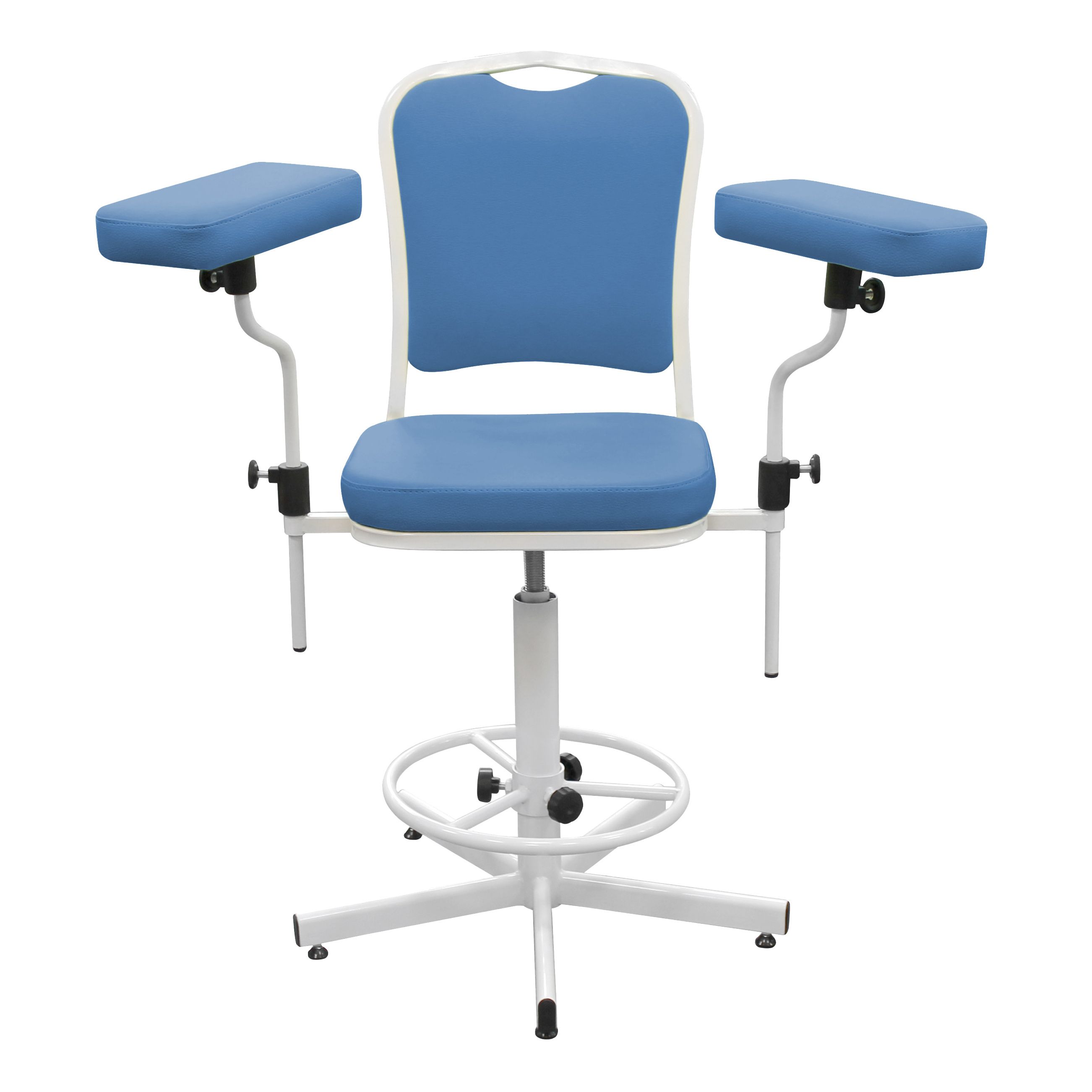Функциональное медицинское кресло ДР03(1) для комфортного размещения пациента при заборе крови и проведении терапевтических процедур. Модель оснащена устойчивой 5-лучевой винтовой опорой, регулируемым по высоте кольцом-упором для ног и удобными подлокотниками с настройкой по высоте и разлёту. Мягкая часть вращается на 360° и сиденье регулируется по высоте в диапазоне 450–570 мм. Обивка — на выбор без доплаты.
