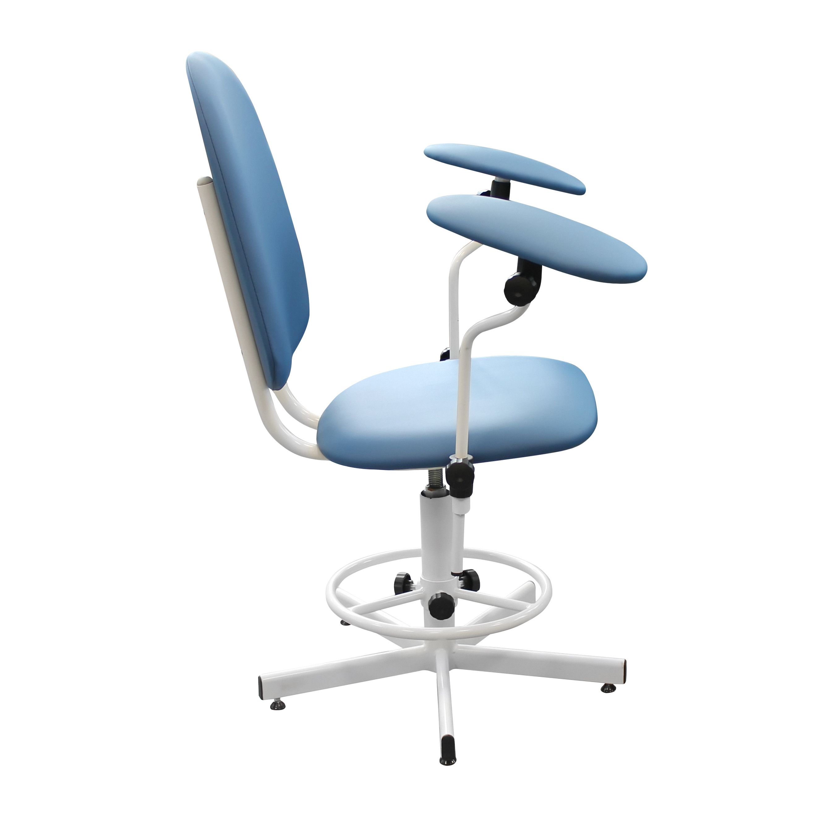 Кресло выполнено на надёжной пятилучевой винтовой опоре. Это та база, которую ценят за прогнозируемую устойчивость: кресло не «гуляет», когда пациент меняет положение, и уверенно стоит в момент фиксации руки. Дополнительно предусмотрено кольцо-опора для ног с регулировкой по высоте — полезная вещь для пациентов разного роста, чтобы ноги не затекали во время ожидания или процедуры.
