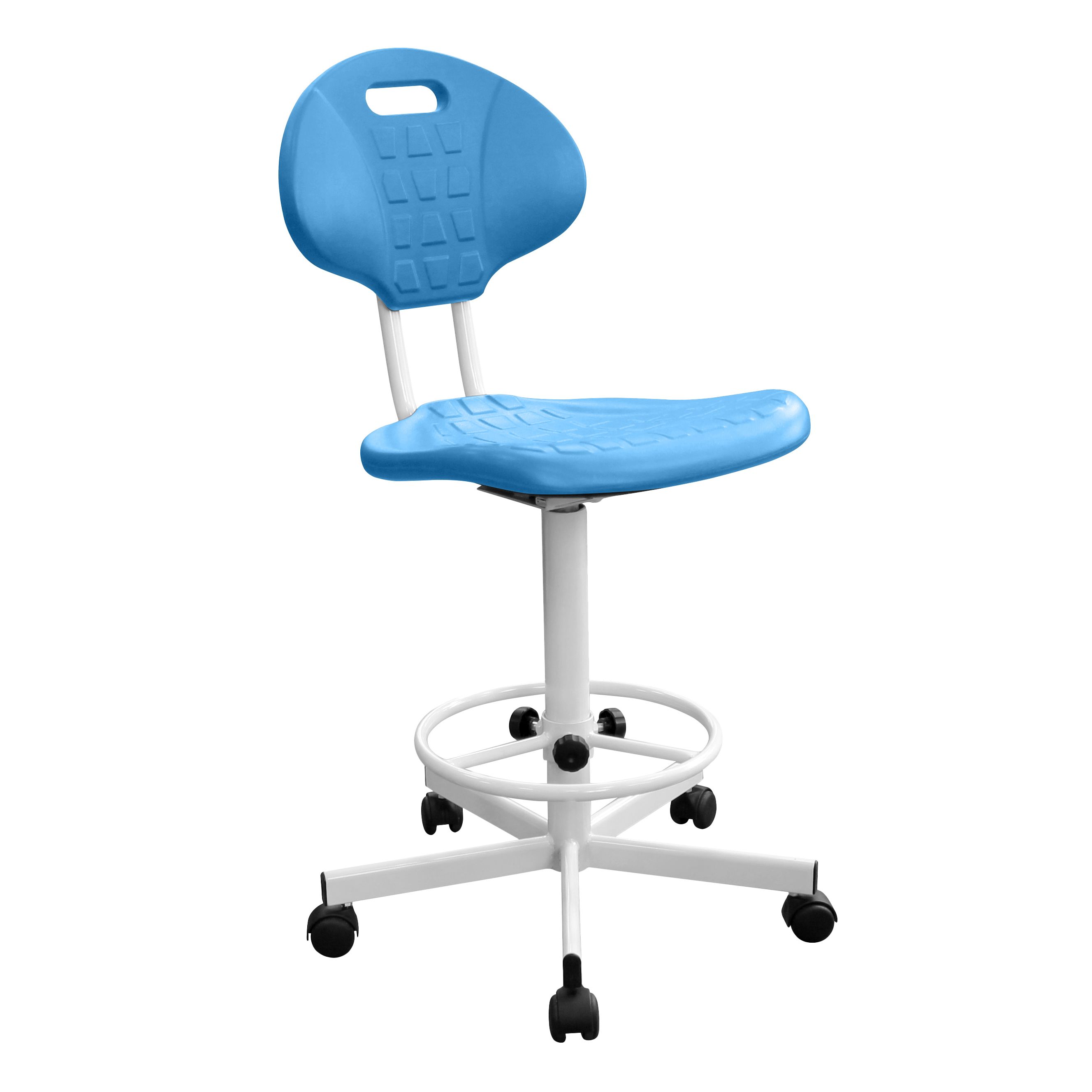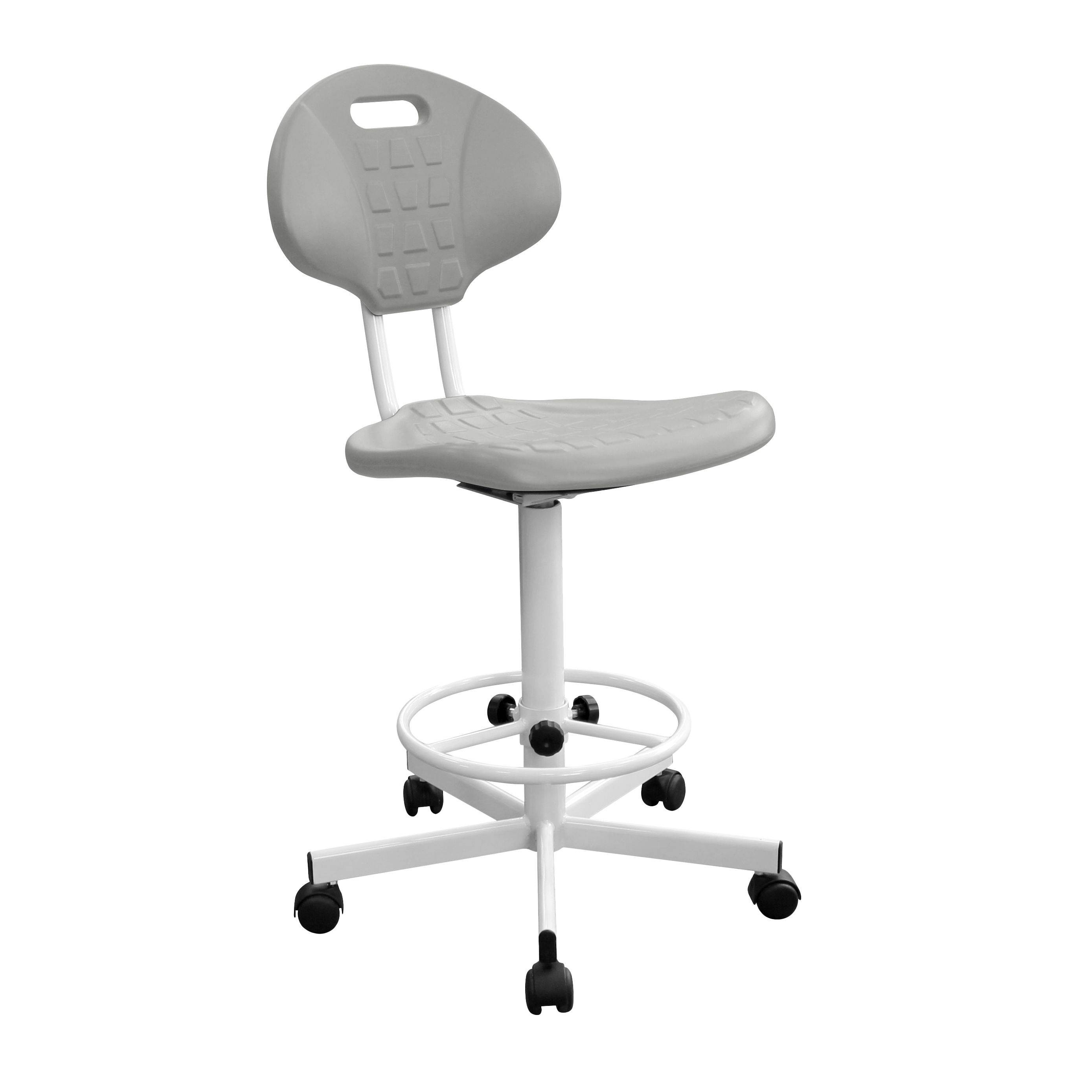 Кресло лабораторное полиуретановое КР10-2К - практичное высокое кресло для рабочих мест с высотой столов от 900 мм, на колесных опорах для удобства перемещения, надёжная винтовая регулировка высоты от 620 до 740 мм, опора-кольцо для ног. Подходит для медицинских учреждений, лабораторий, учебных и производственных помещений, а также офиса. Полиуретановые сиденье и спинка обеспечивают комфорт, легко очищаются и рассчитаны на интенсивную эксплуатацию.