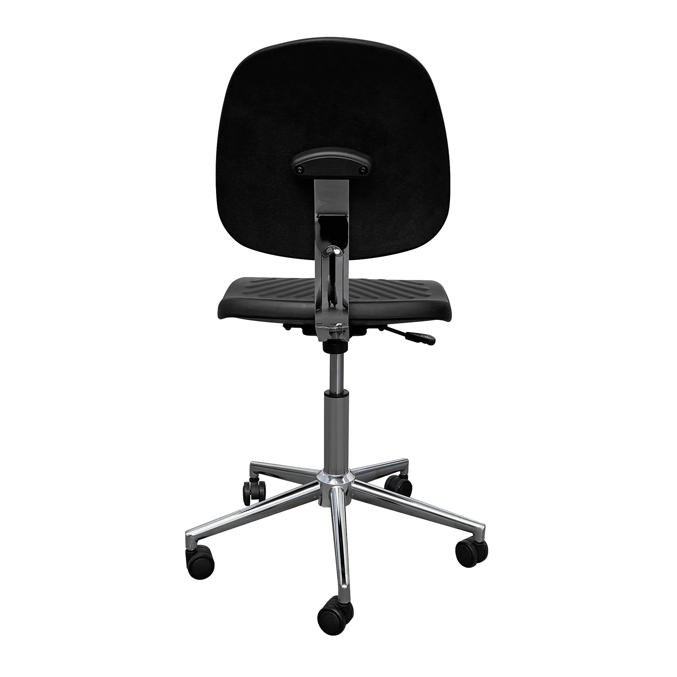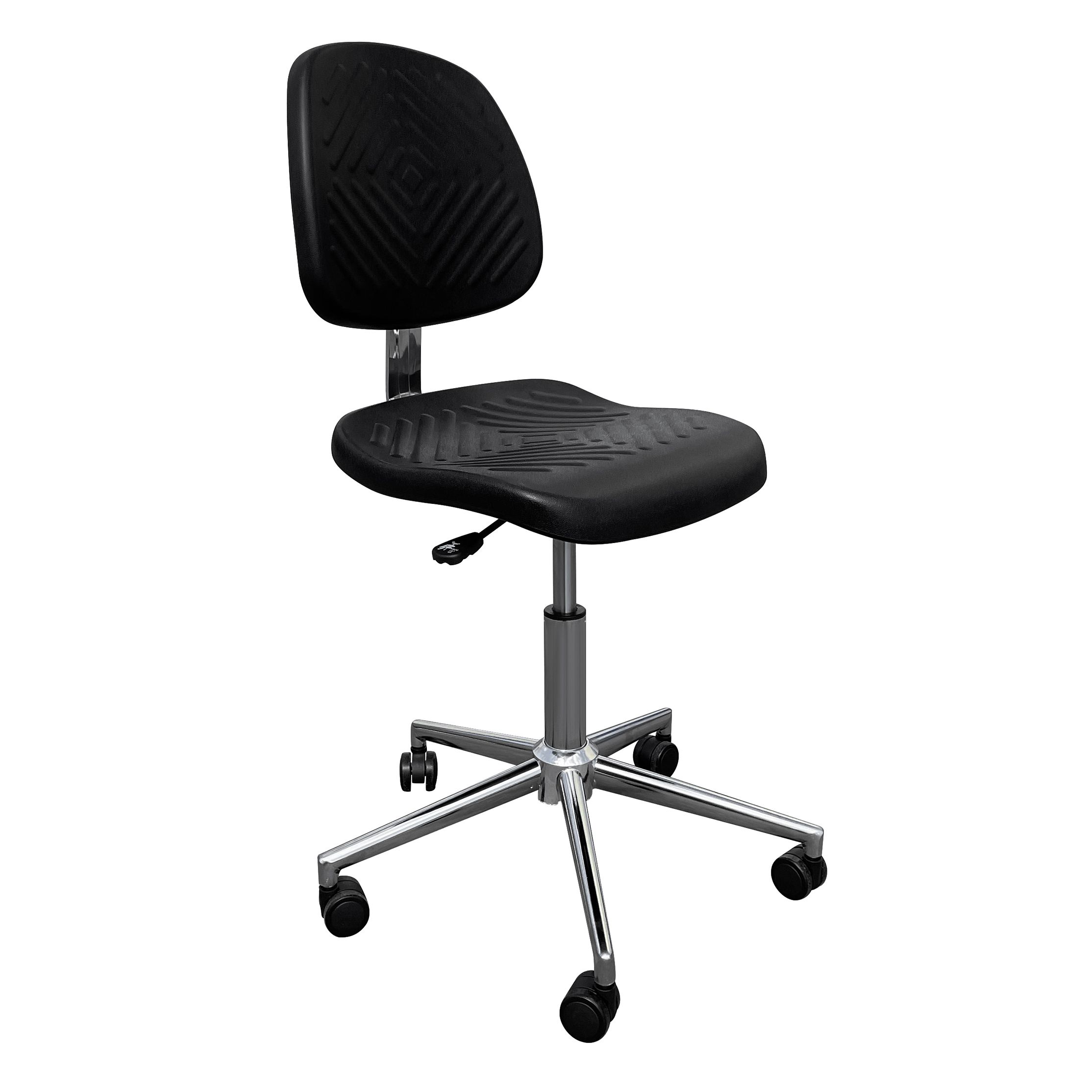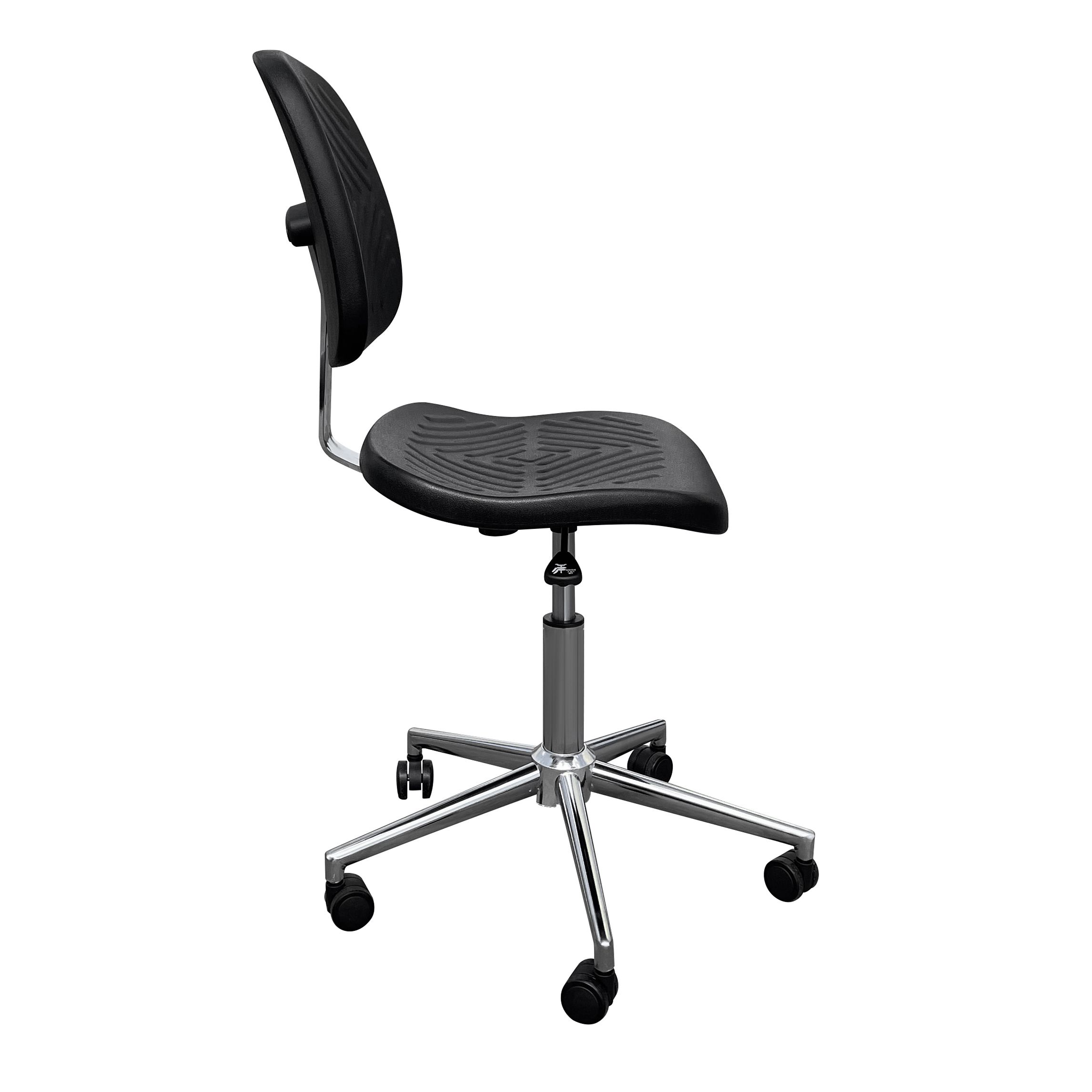Полиуретановые сиденье и спинка доступны в чёрном цвете — универсально для медицинских и лабораторных интерьеров, практично в ежедневной эксплуатации. Металлическая часть выполнена с хромированным (гальваническим) покрытием, которое подчёркивает «чистую» профессиональную эстетику кресла.