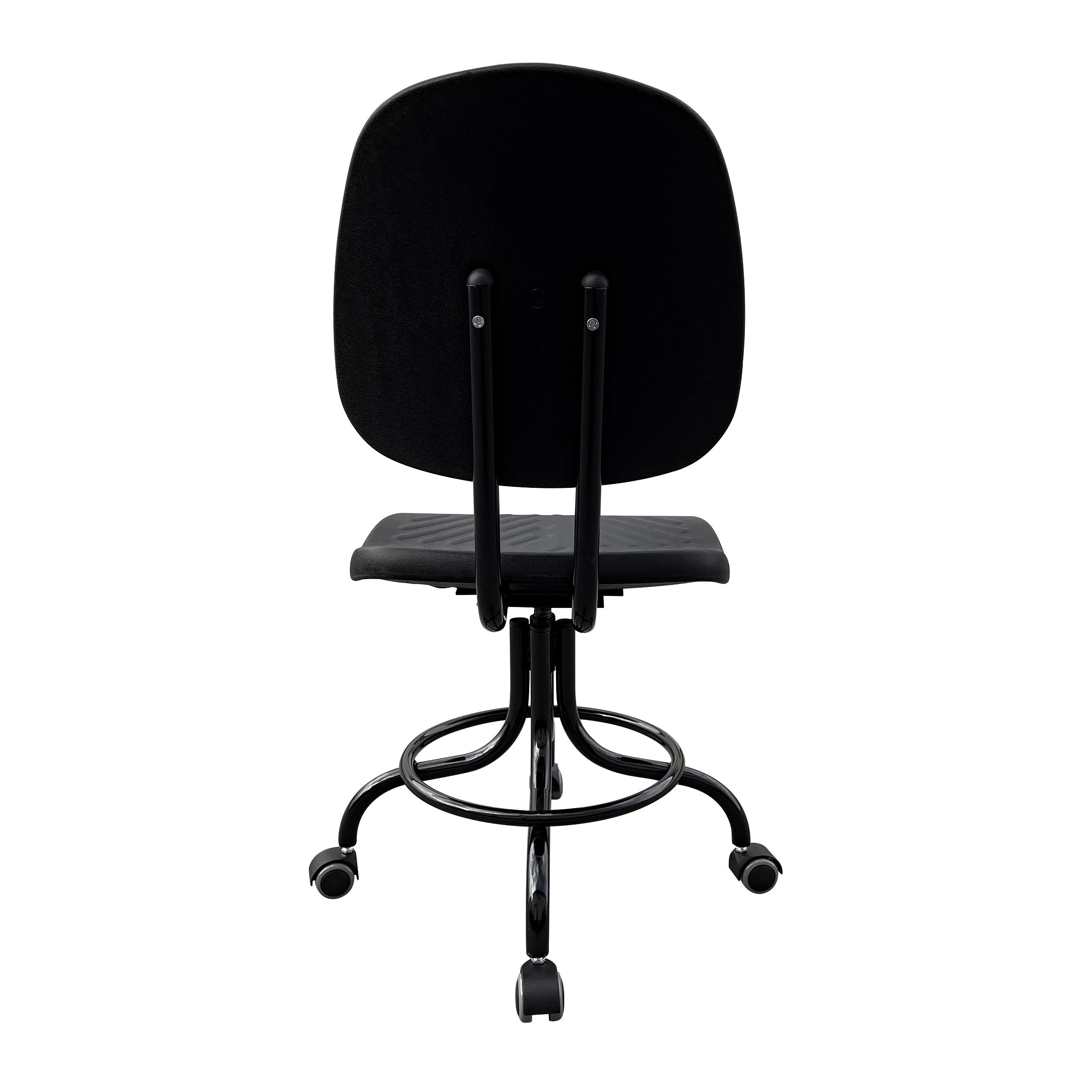 Кресло КР10-1 (1) построено на надёжной винтовой опоре. Высота сиденья регулируется в диапазоне 440–560 мм, что удобно для сотрудников разного роста и для рабочих поверхностей разной высоты. Кольцо-опора для ног снижает нагрузку при посадке на повышенной высоте и помогает «разгрузить» ноги во время длительных смен.