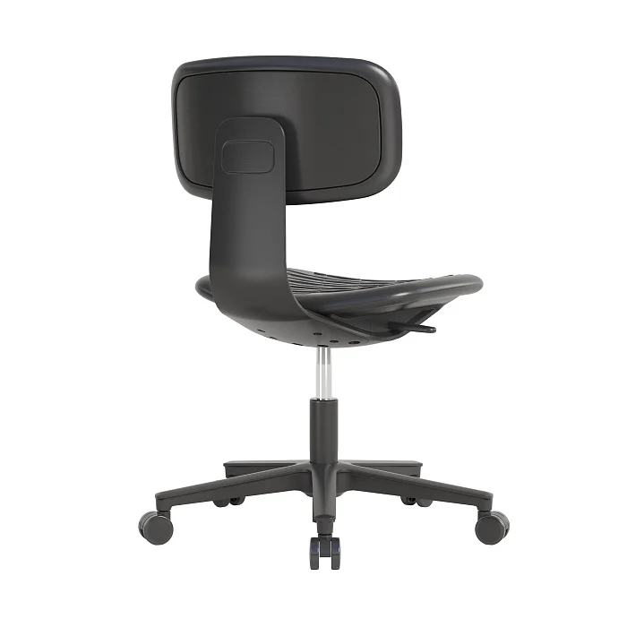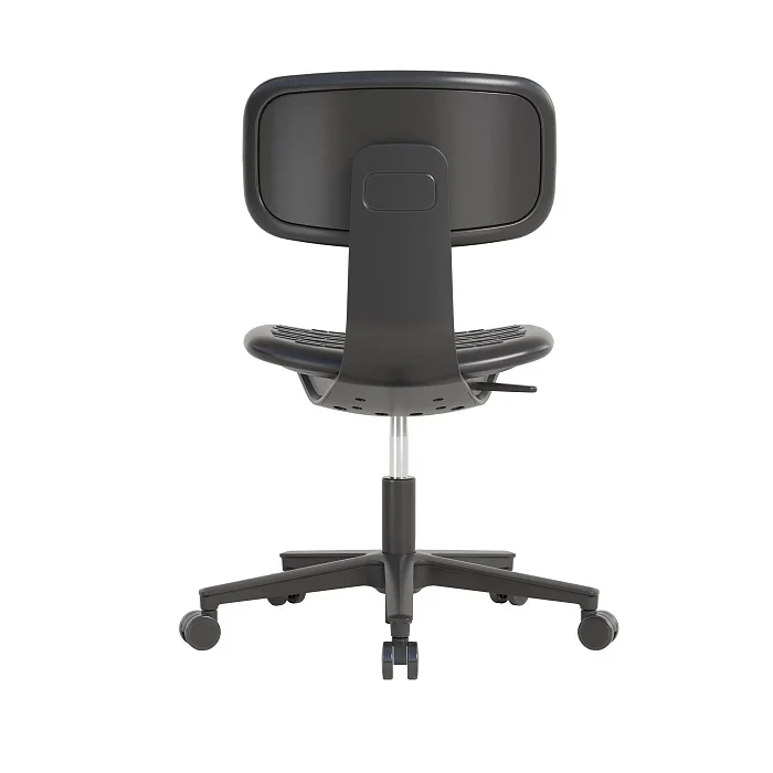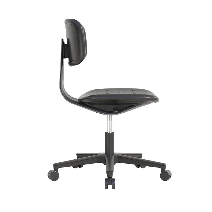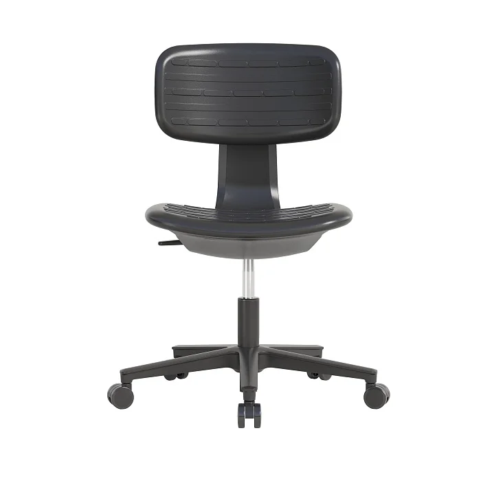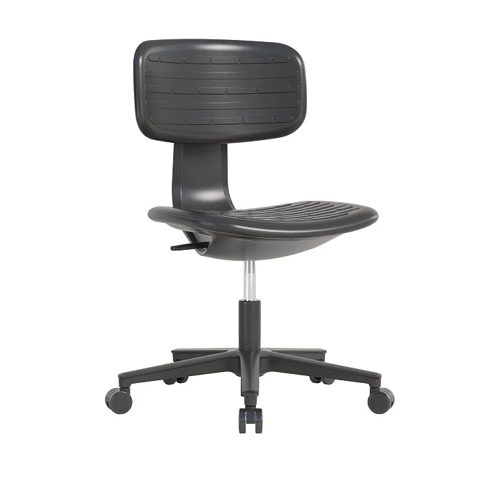 Сиденье и спинка выполнены из полиуретана — материала, который ценят за «правильную» упругость и живучесть в условиях ежедневного использования. По ощущениям он мягче фанеры и большинства пластиков, поэтому на таком кресле комфортнее работать в течение смены, особенно когда приходится часто садиться/вставать и перемещаться по зоне.