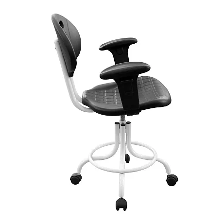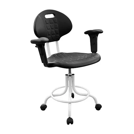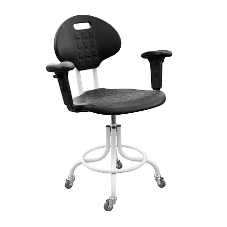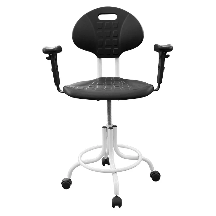 Сиденье и спинка выполнены из полиуретана — материала, который хорошо переносит интенсивную эксплуатацию в медицине и лаборатории. Он упругий и комфортный, при этом рассчитан на регулярную уборку и обработку.