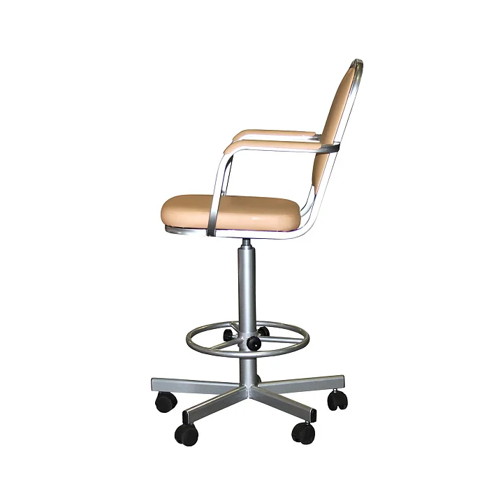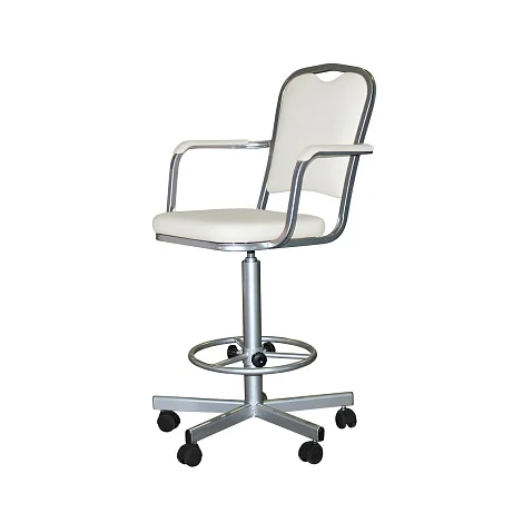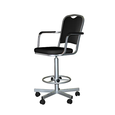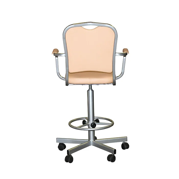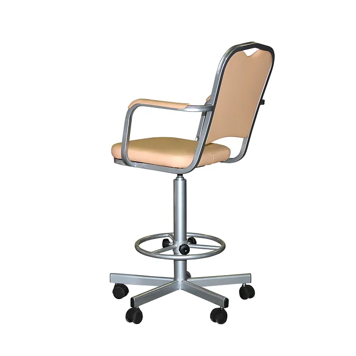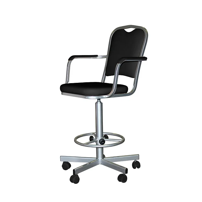 Высокое лабораторное кресло КР02-1 с подлокотниками создано для работы за столами от 900 мм и выше, когда обычный офисный стул уже не справляется. Надёжная винтовая опора позволяет плавно подобрать комфортную высоту сиденья в диапазоне 600–740 мм, а регулируемое кольцо-подставка под ноги разгружает ноги при длительной работе и помогает сохранить нормальное кровообращение.