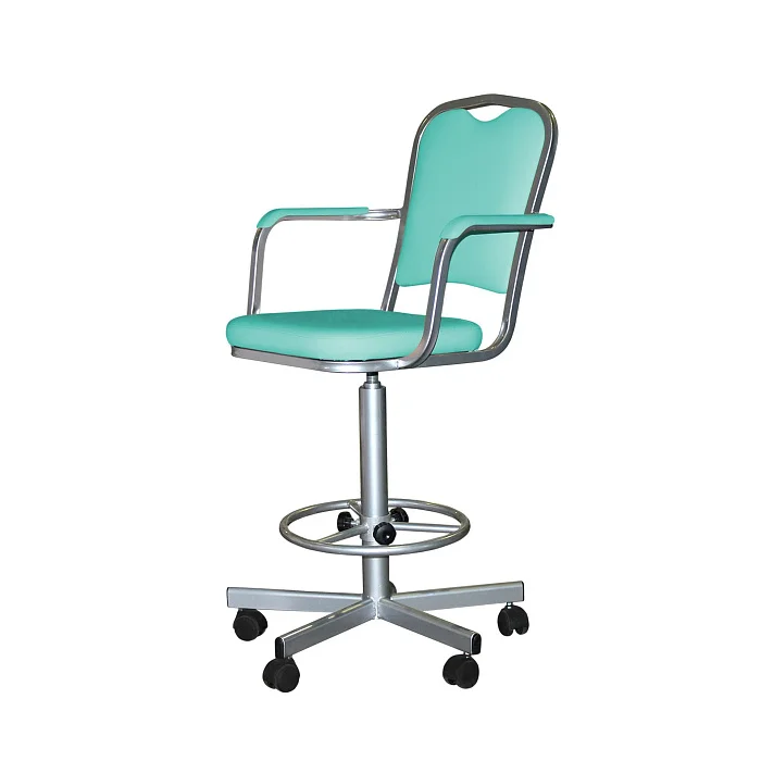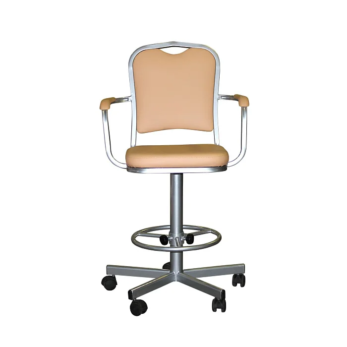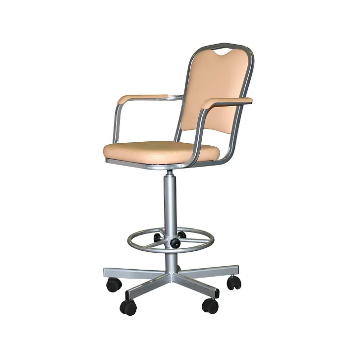 Кресло имеет надёжную винтовую опору, кольцо-опору для ног с регулировкой по высоте, на колёсиках.