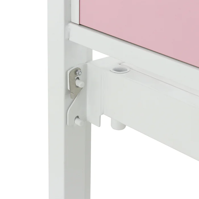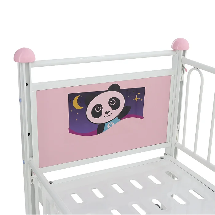 Спинки изготовлены из стальных профильных труб с высококачественным полимерно-порошковым покрытием. Дополнительная МДФ-вставка с анимационной наклейкой с внутренней и внешней стороны делает кровать визуально более дружелюбной для ребенка. Это небольшая, но важная деталь, которая помогает смягчить строгость медицинской обстановки и создать более спокойную атмосферу в палате.