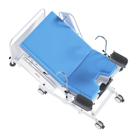 Диапазон высоты по ложементу 600–940 мм достигается электроприводом с управлением с пульта — это уменьшает нагрузку на спину медработника при переводе пациентки, установке датчиков мониторинга и проведении манипуляций. Электроподъём спинки 0…70° облегчает подбор положения для дыхательных техник и обезболивания, а также обеспечивает удобство при проведении осмотра. Режим Тренделенбург/антитренделенбург в пределах +14°/−5° (пневмопружина) поддерживает клинические алгоритмы при кратковременной необходимости изменения гемодинамики и облегчает доступ при манипуляциях.
