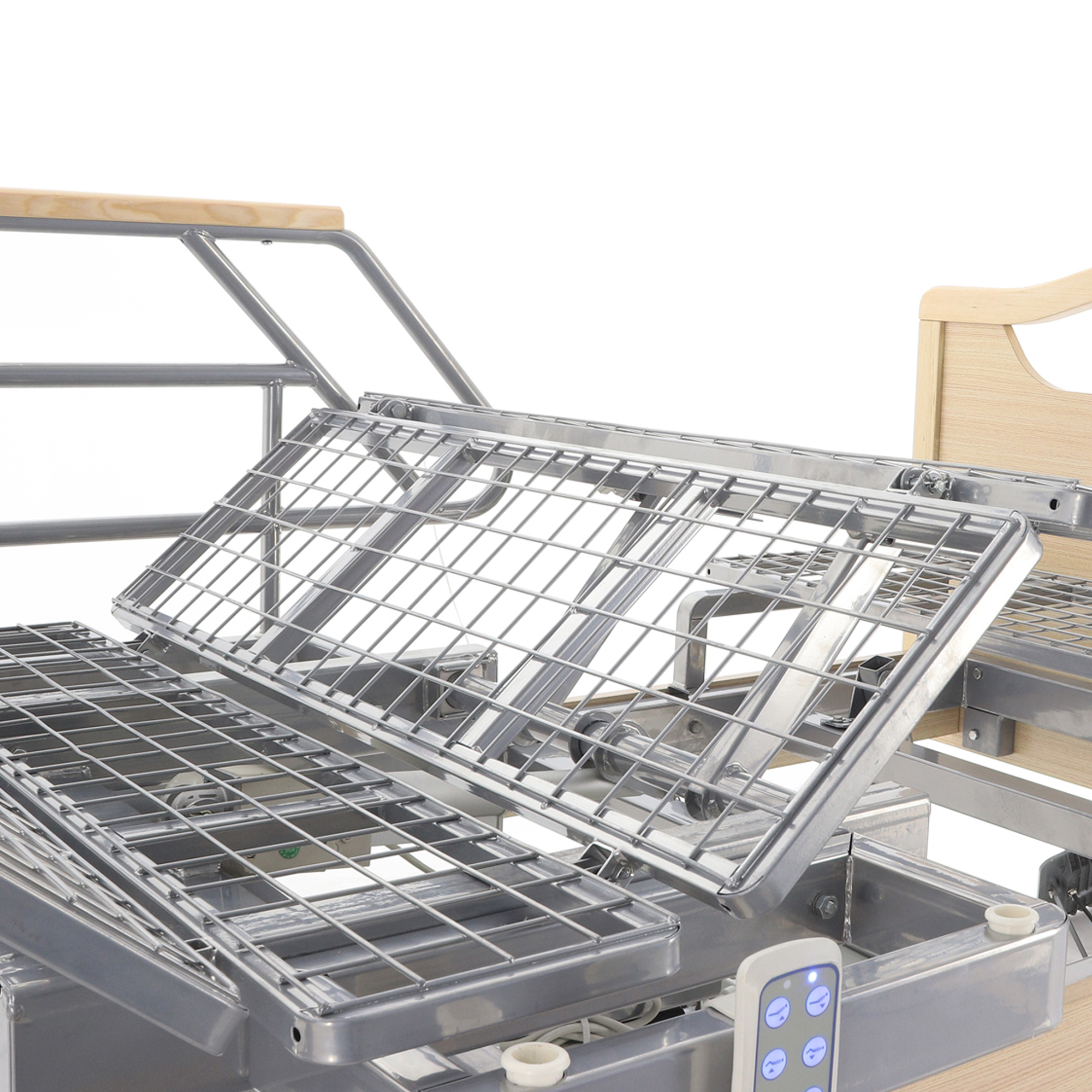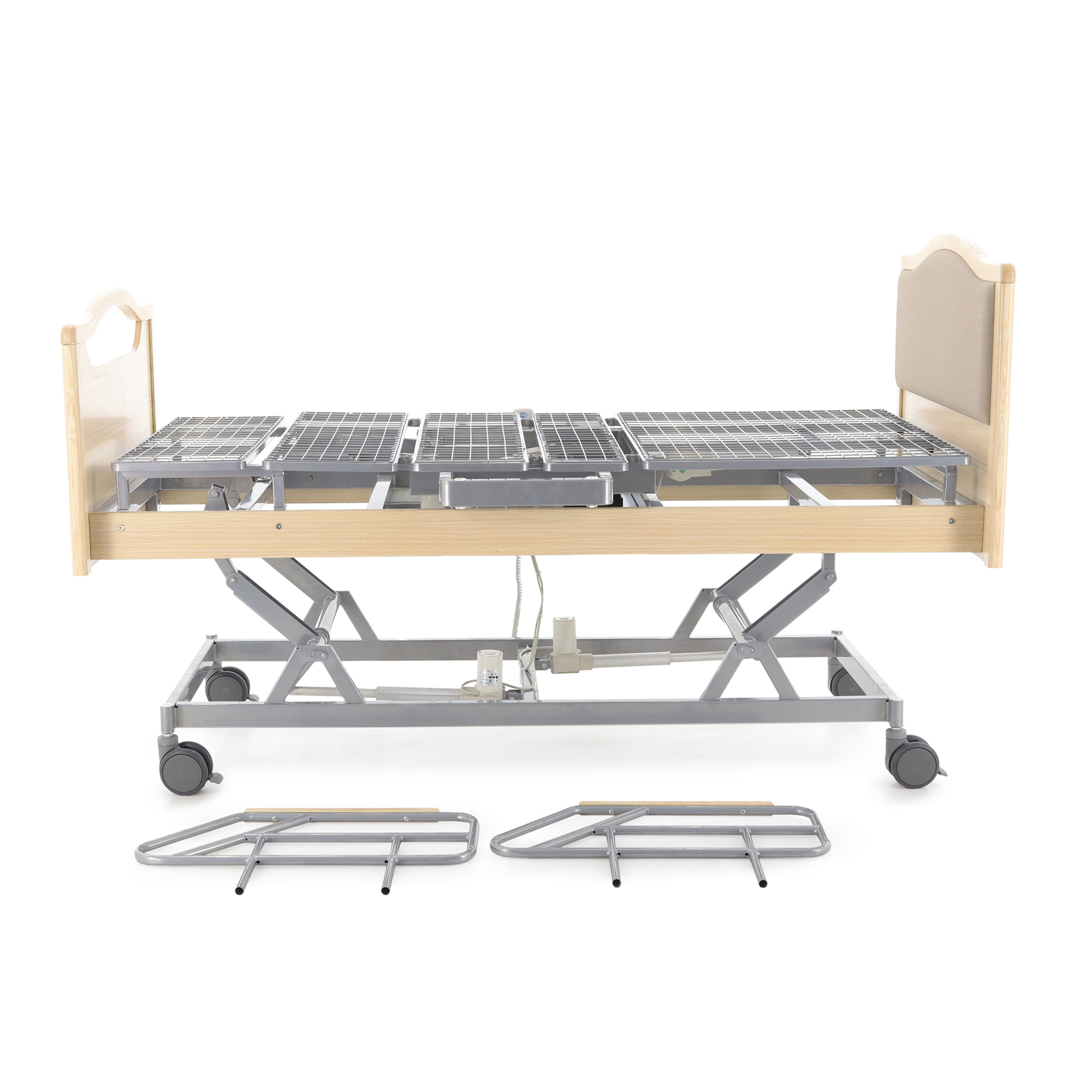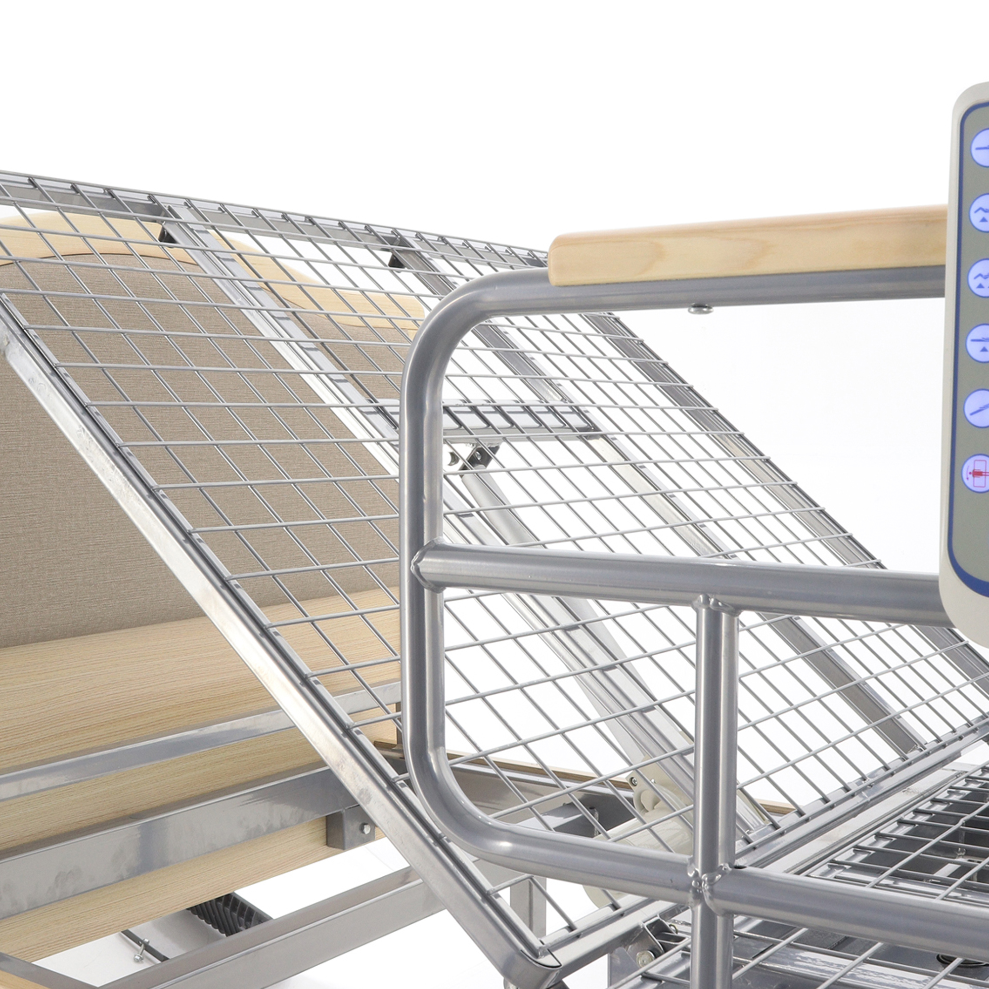 Боковые ограждения быстро снимаются при необходимости, но в рабочем положении надёжно защищают пациента от случайного падения. Деревянные поручни делают контакт более комфортным и приятным на ощупь. Головная и ножная спинки из клееного массива бука в светлом тоне придают кровати аккуратный, современный и менее утилитарный вид, что важно для психологического комфорта пациента.