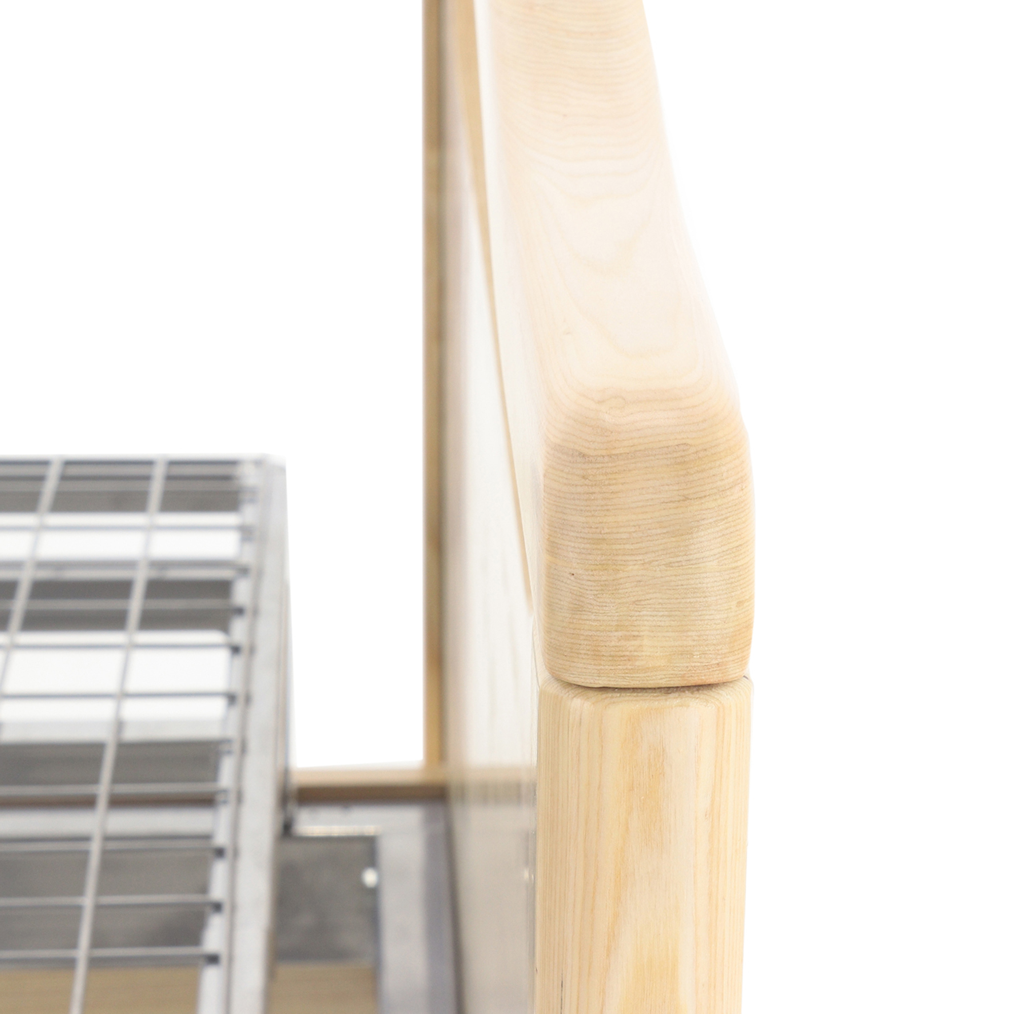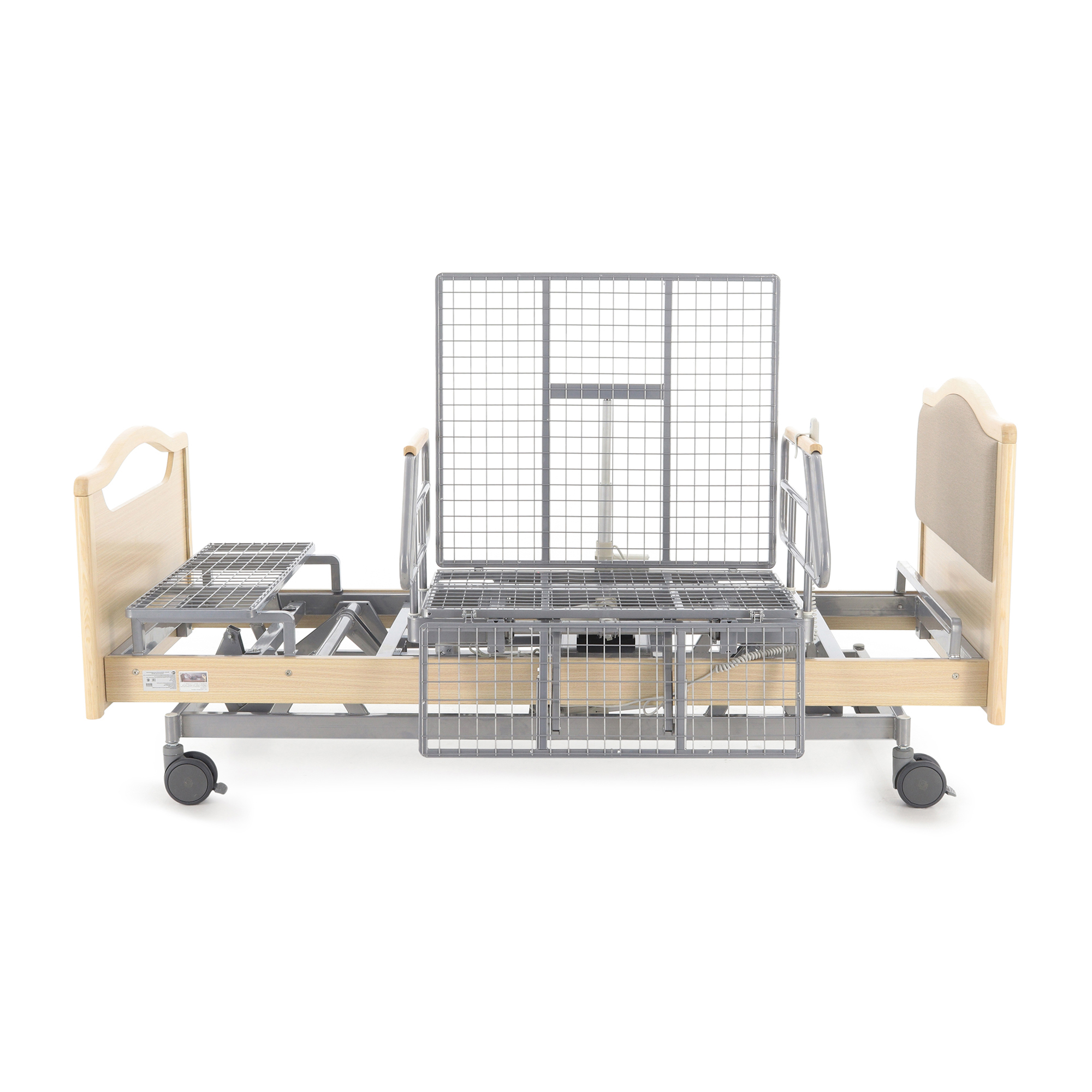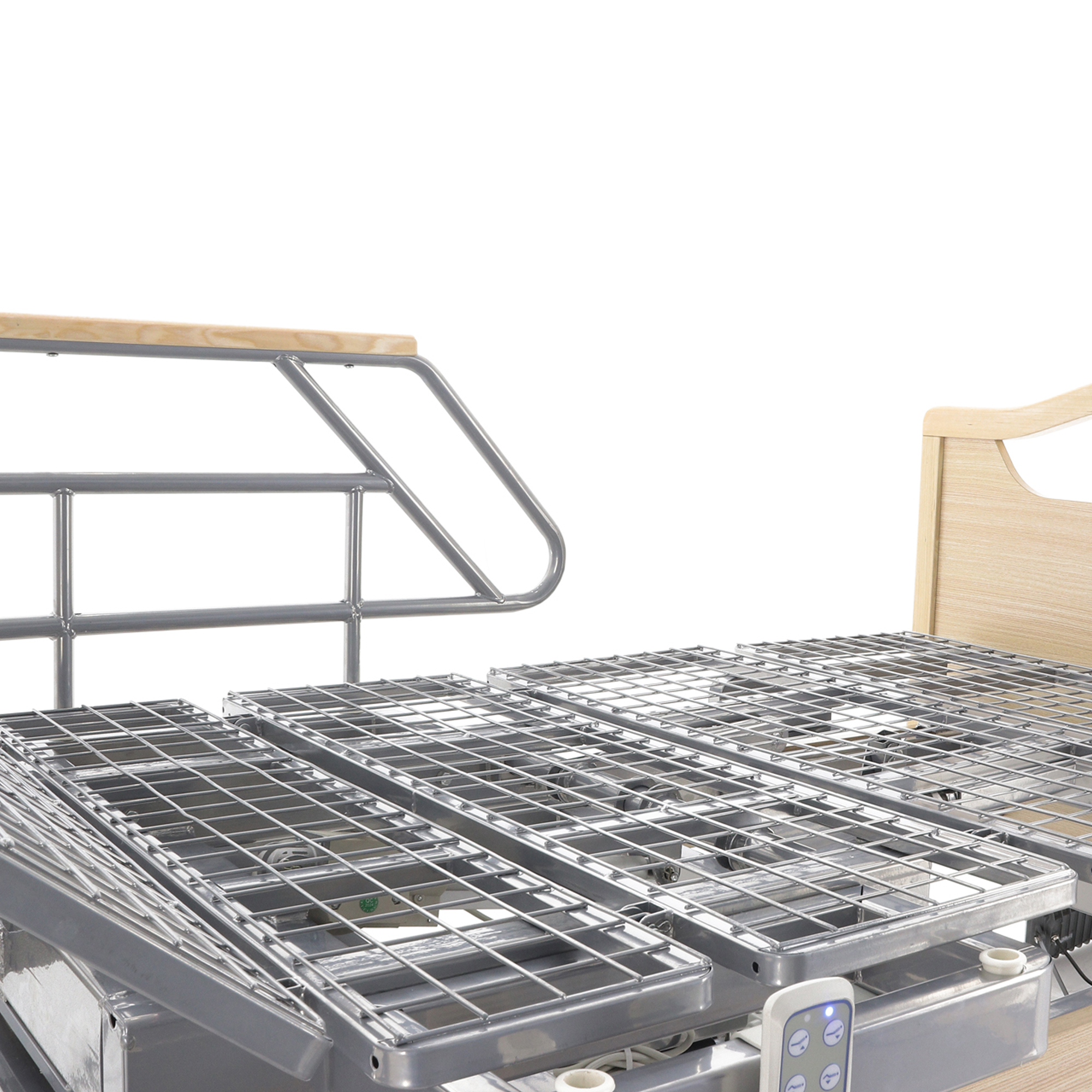 Боковые ограждения быстро снимаются при необходимости, но в рабочем положении надёжно защищают пациента от случайного падения. Деревянные поручни делают контакт более комфортным и приятным на ощупь. Головная и ножная спинки из клееного массива бука в светлом тоне придают кровати аккуратный, современный и менее утилитарный вид, что важно для психологического комфорта пациента.
