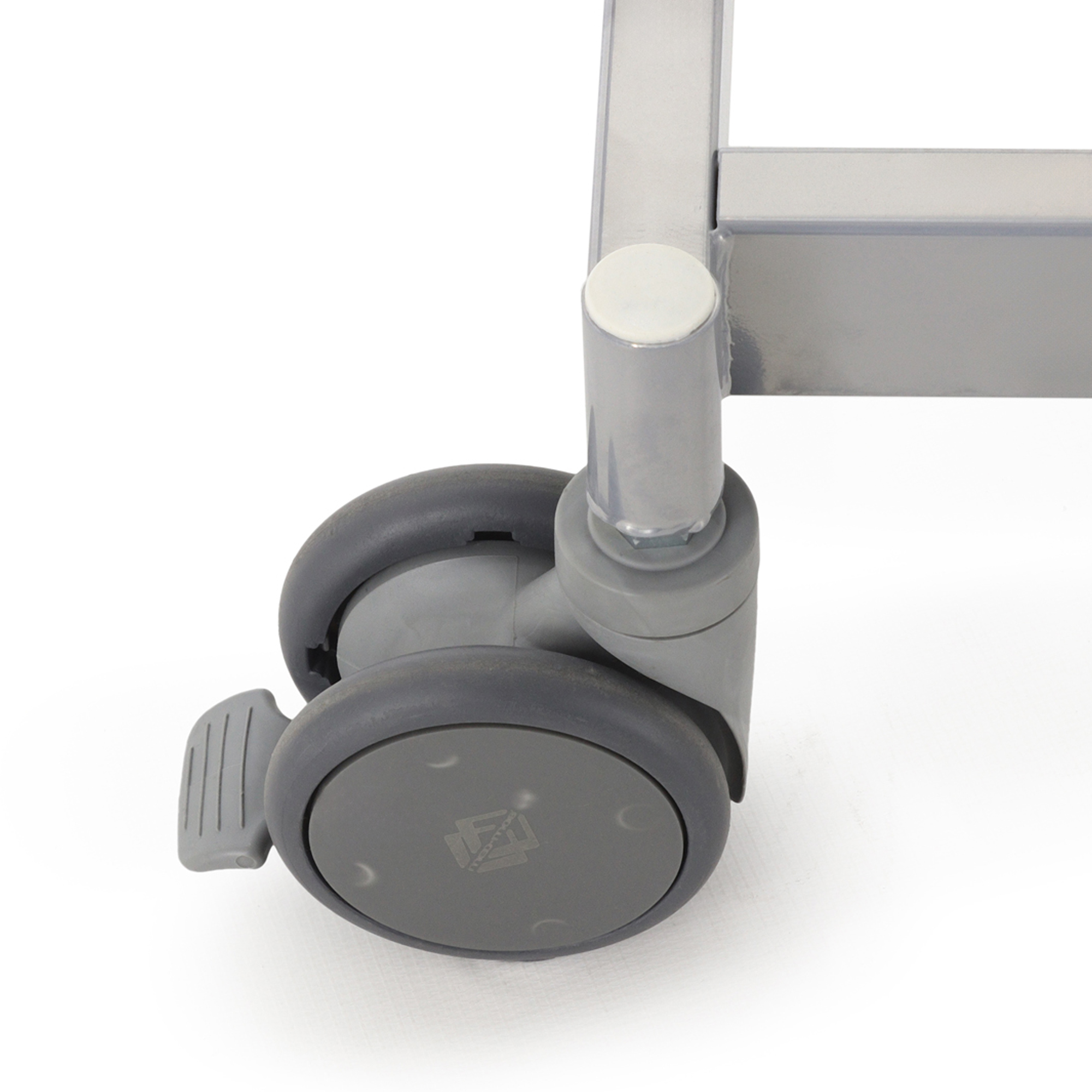 Кровать установлена на четыре самоориентирующихся двойных колеса диаметром 117 мм с полиуретановыми шинами. Такая база обеспечивает плавное перемещение по помещению, помогает при перестановке и упрощает обслуживание пространства вокруг пациента. Индивидуальные тормоза на каждом колесе позволяют быстро и надёжно зафиксировать кровать в выбранной точке.