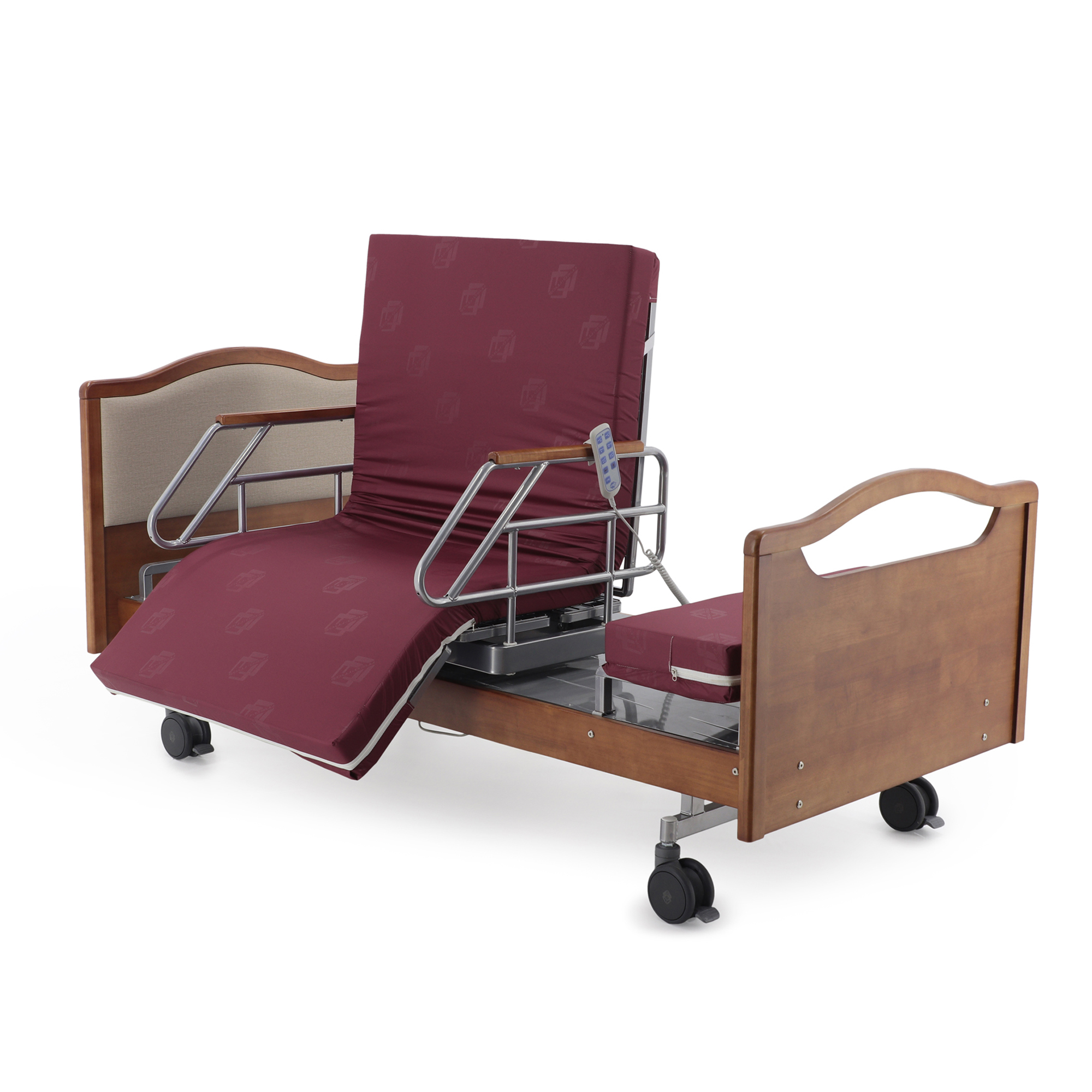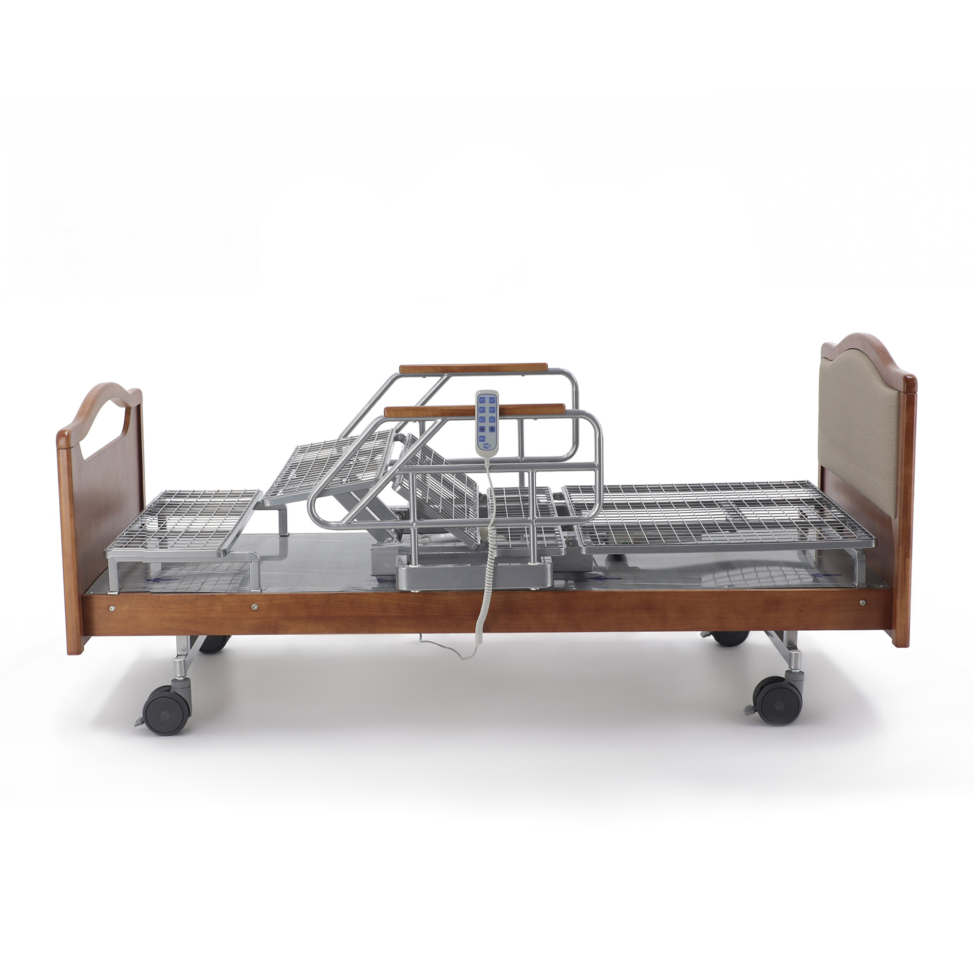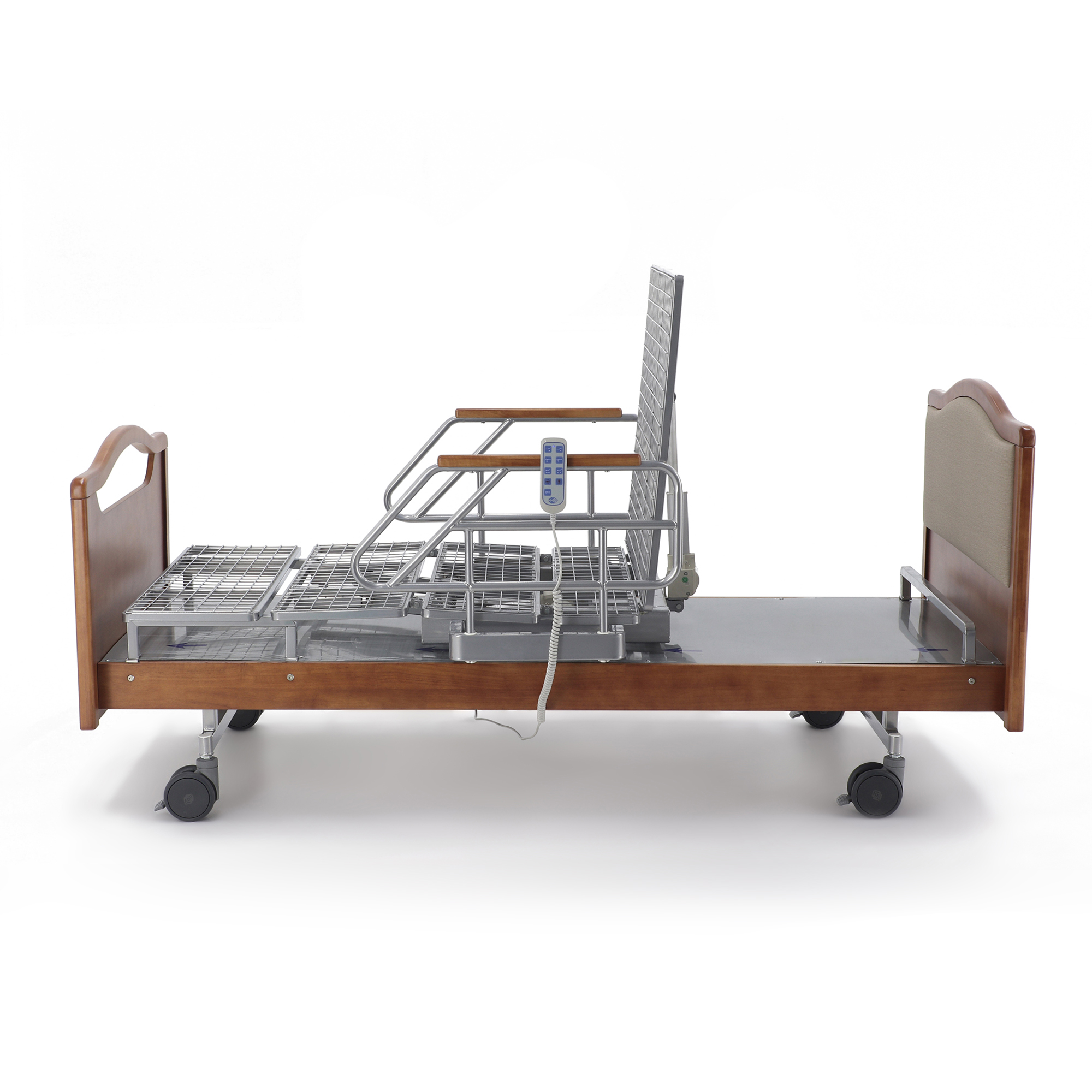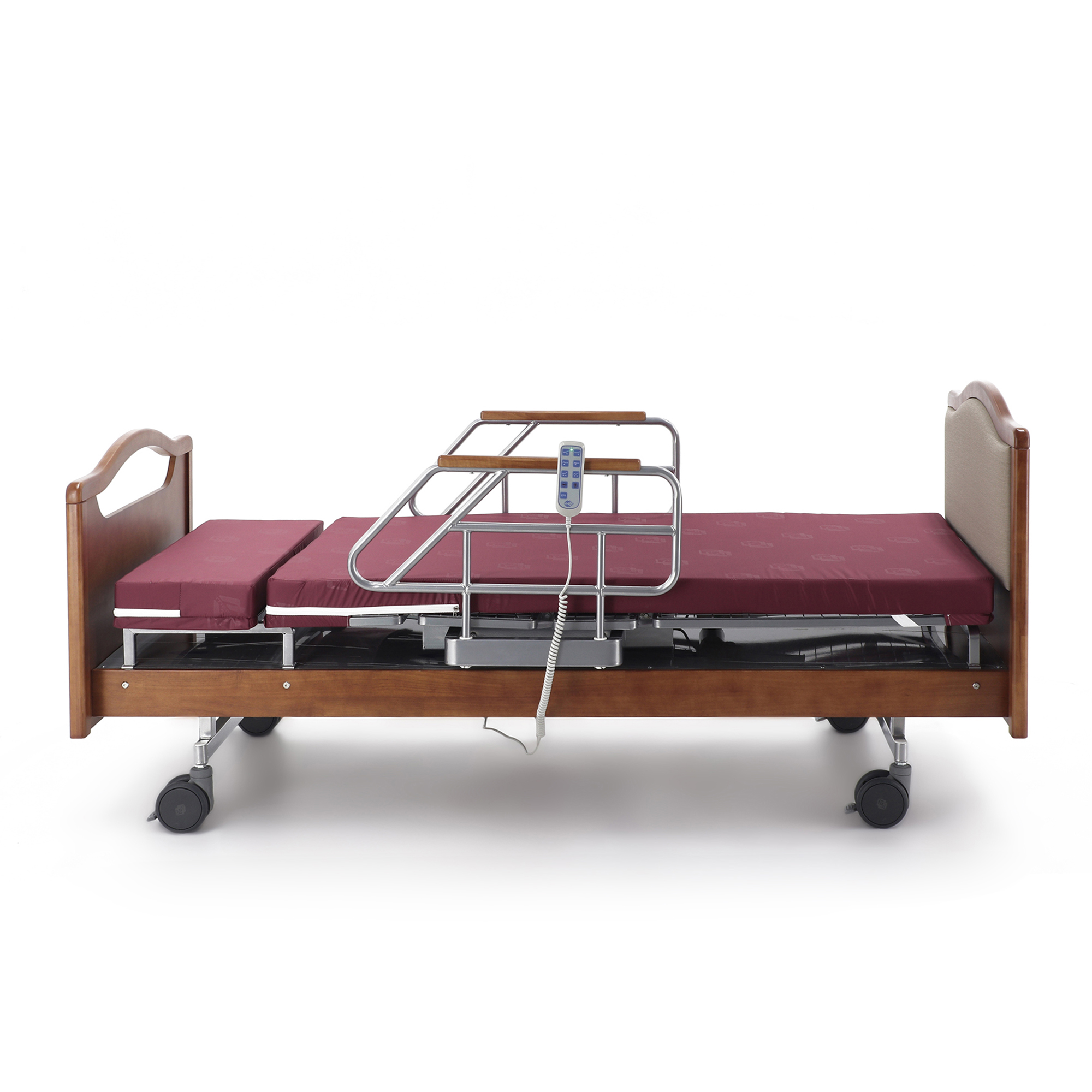 Одно из главных достоинств этой модели — удобное электрическое управление тремя секциями. Медицинский персонал или сам пациент с помощью пульта могут быстро изменить конфигурацию ложа под конкретную задачу: отдых, прием пищи, проведение процедур, осмотр или посадку. Это особенно важно в отделениях длительного ухода и в домашних условиях, где приходится часто подстраивать положение кровати под состояние человека в течение дня.