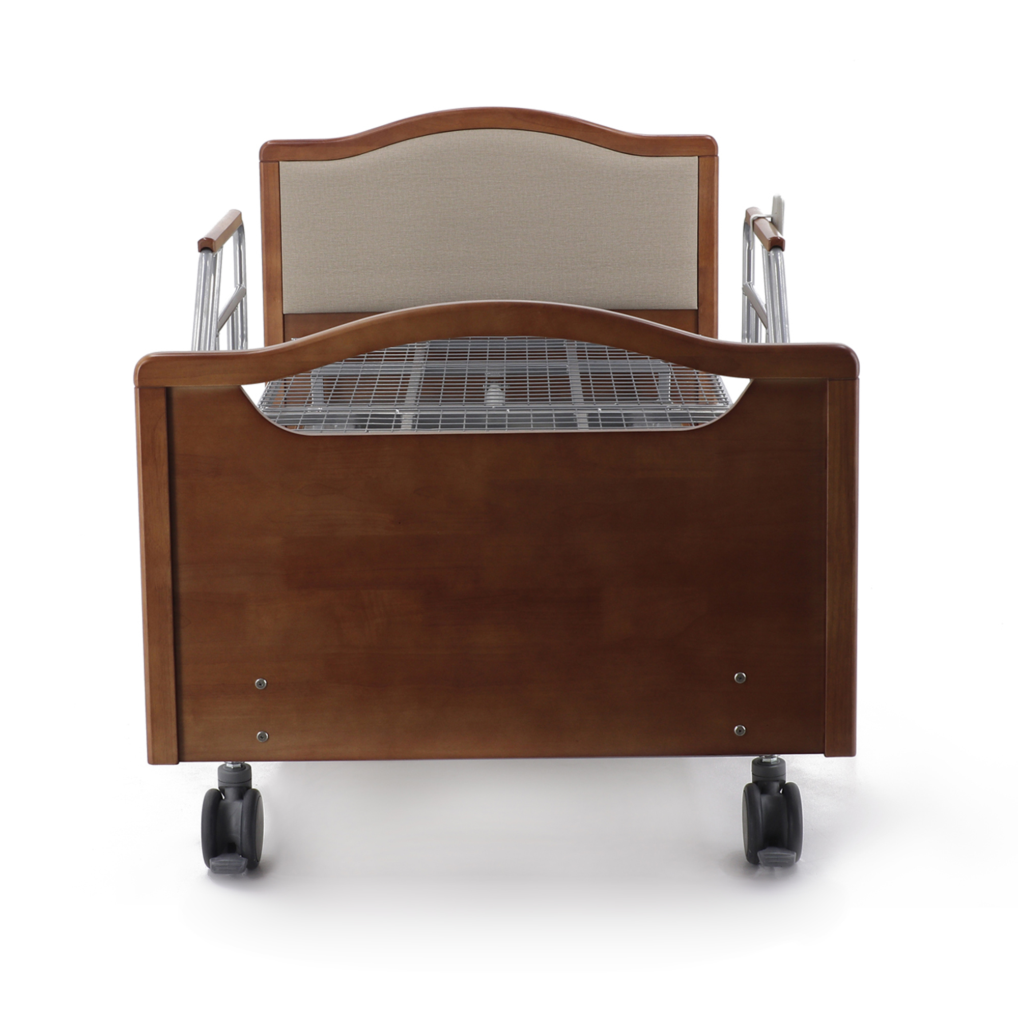 Основа кровати выполнена из прочного металлического каркаса, рассчитанного на интенсивное ежедневное использование. Декоративные и контактные элементы дополнены деревянными накладками, благодаря чему конструкция выглядит аккуратно, солидно и менее «холодно» визуально, что особенно ценится в палатах длительного пребывания и при домашнем уходе. Спинки изготовлены из клееного массива бука и ЛДСП, имеют удобные прорези и хорошо вписываются в общий дизайн модели.