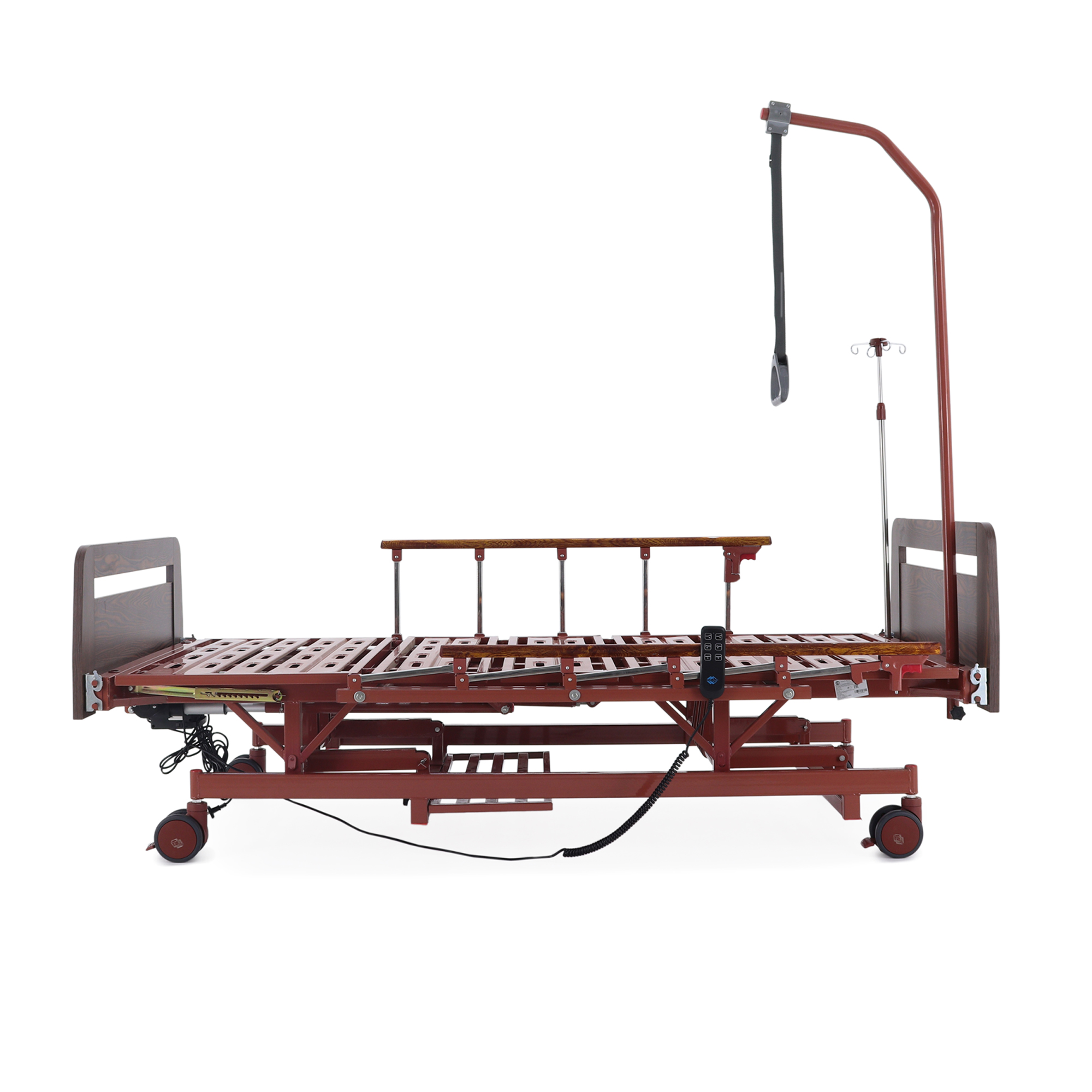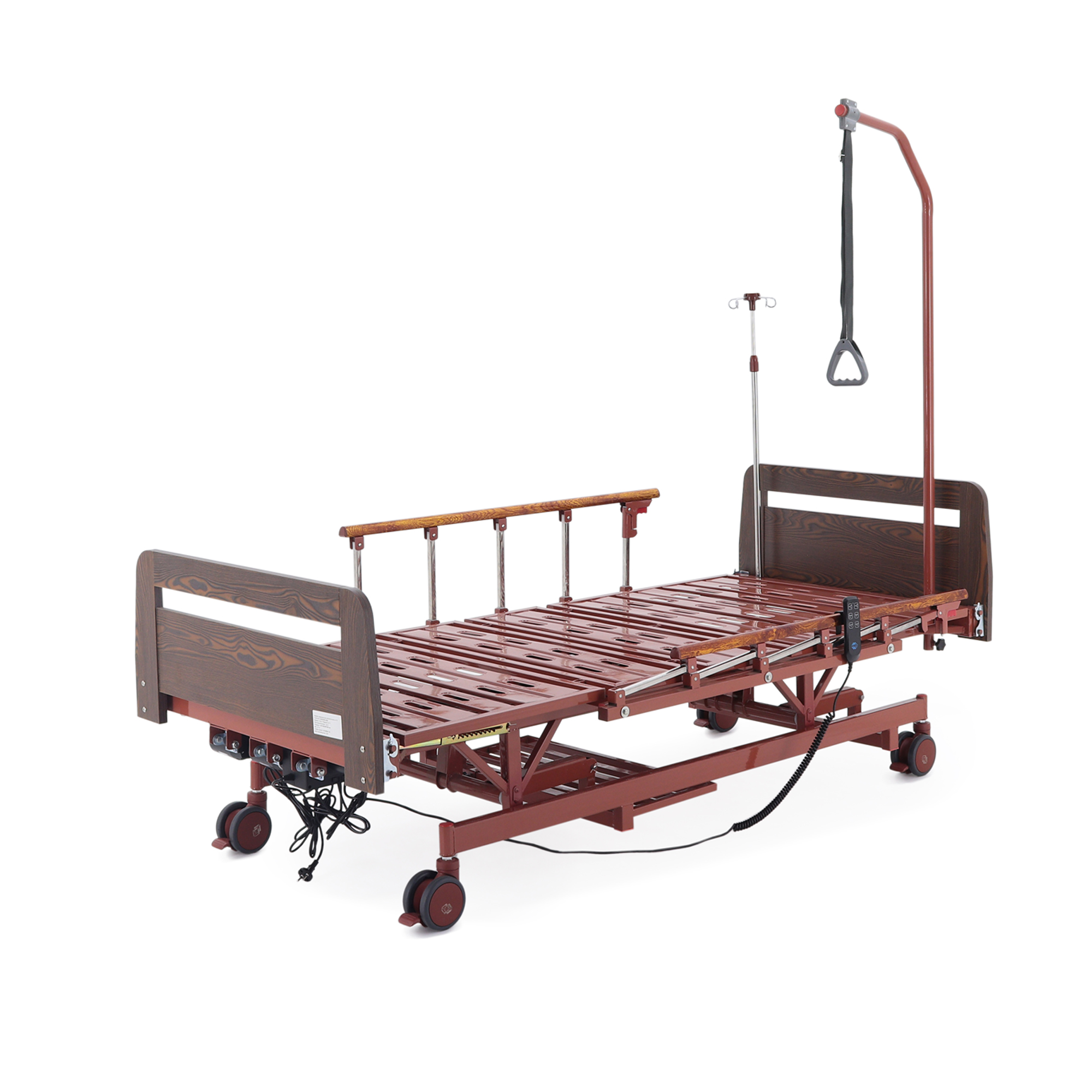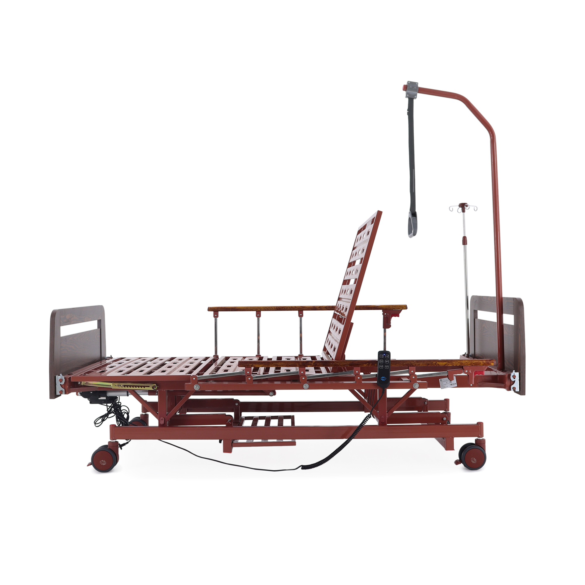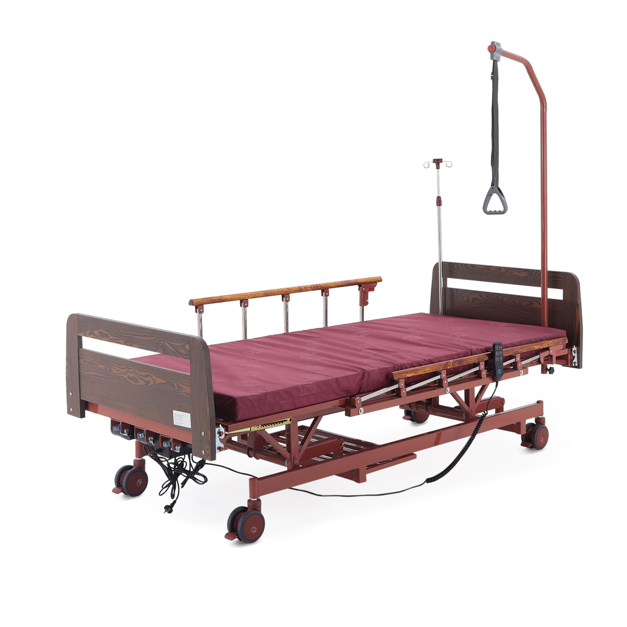 Удобно для закупки: кровать закрывает сразу несколько задач — позиционирование, уход, размещение принадлежностей и подключение инфузионной стойки — без необходимости «добивать» комплект мелкими аксессуарами.