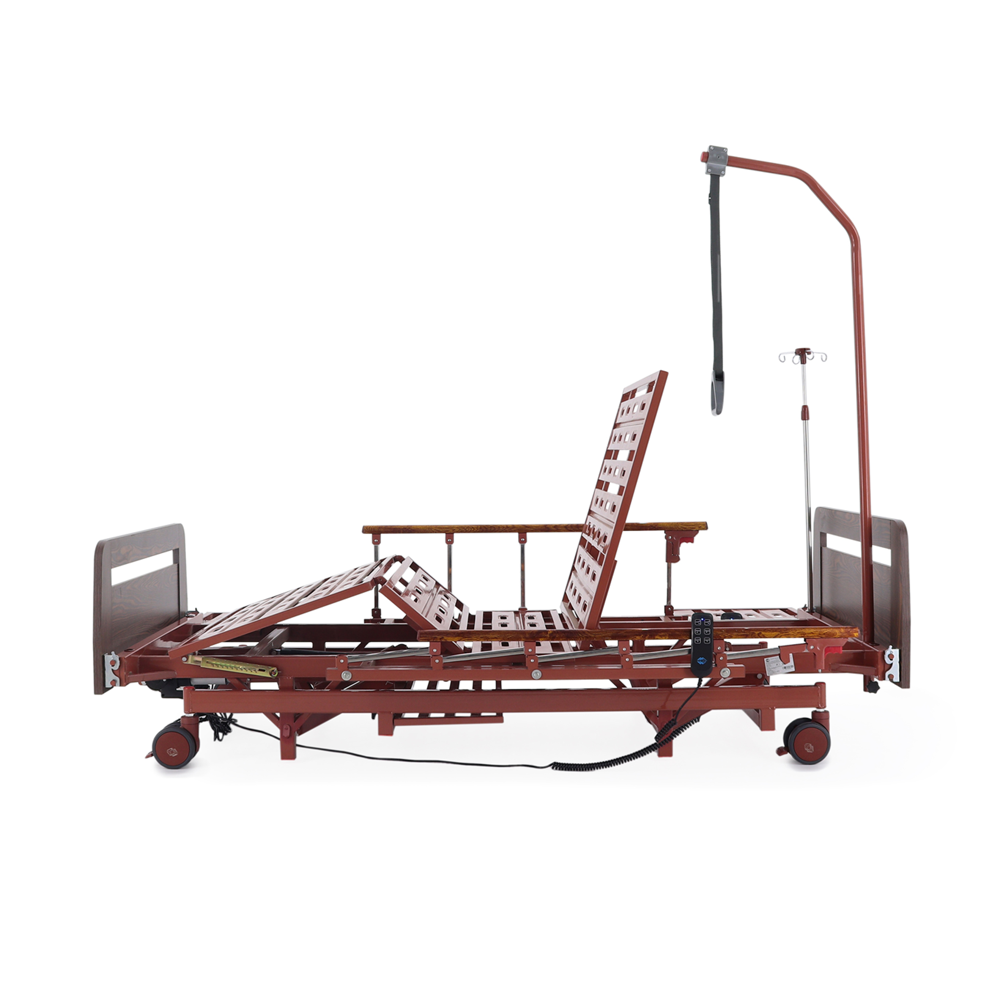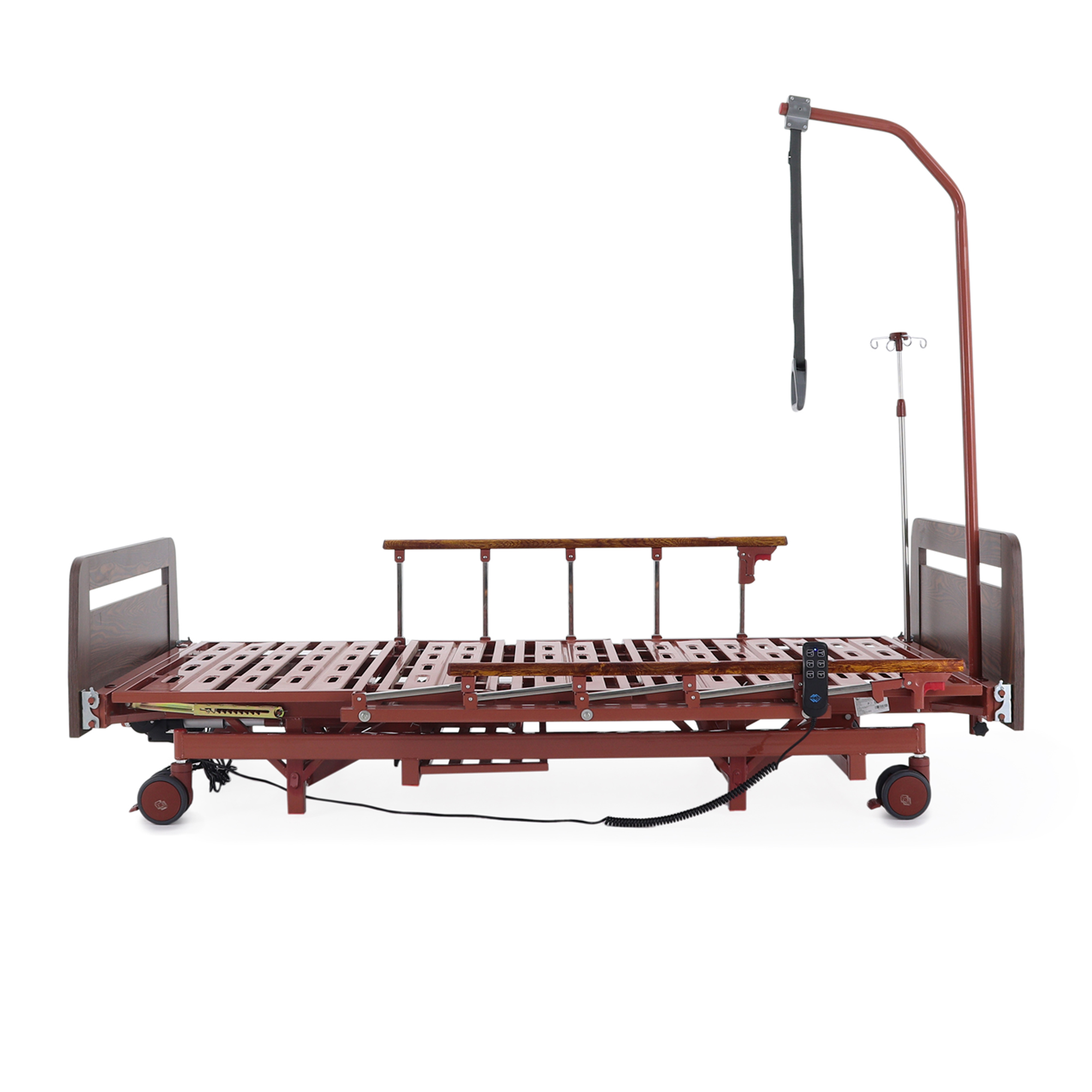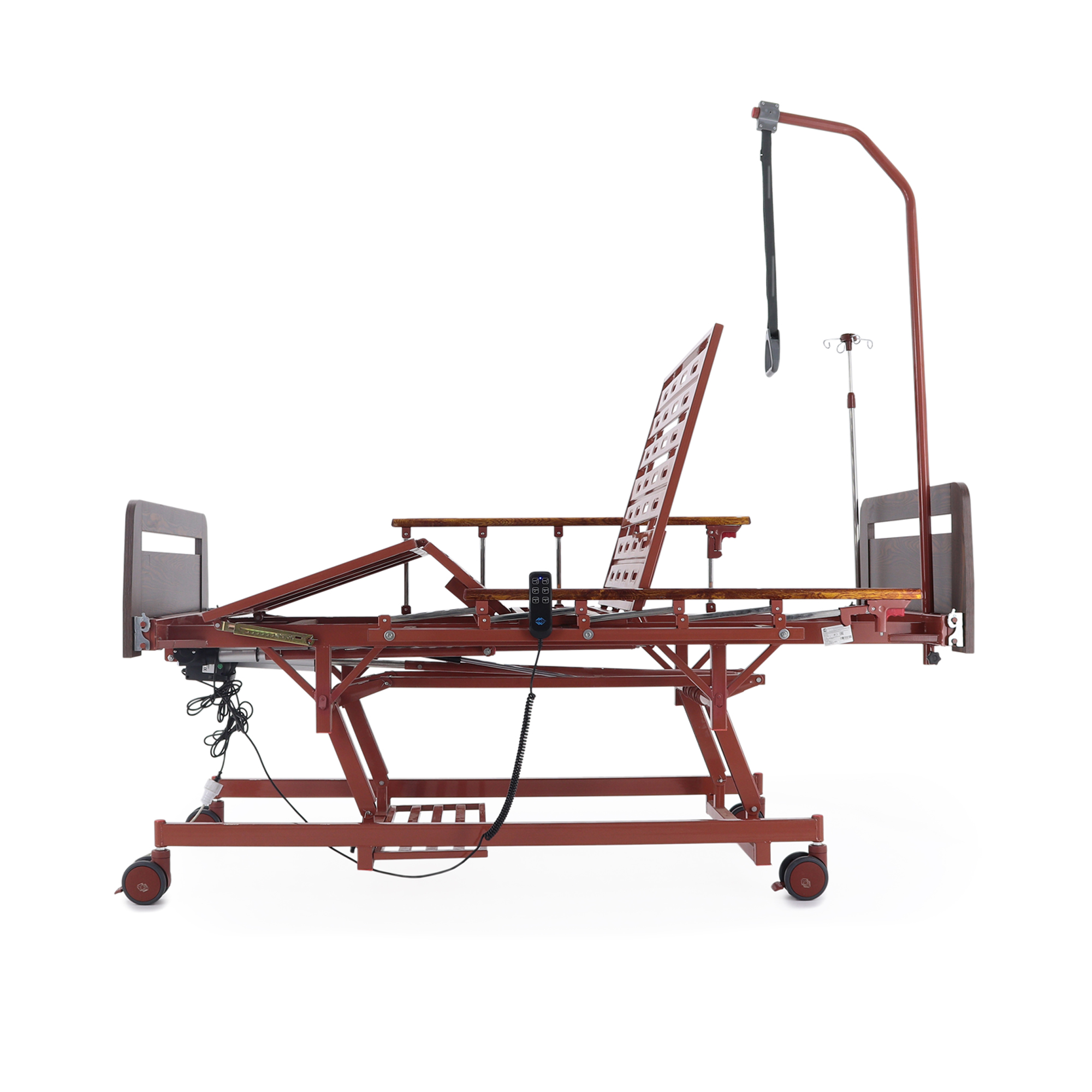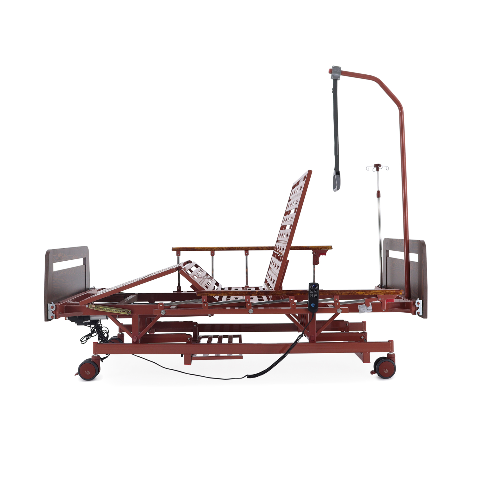 Удобно для закупки: кровать закрывает сразу несколько задач — позиционирование, уход, размещение принадлежностей и подключение инфузионной стойки — без необходимости «добивать» комплект мелкими аксессуарами.