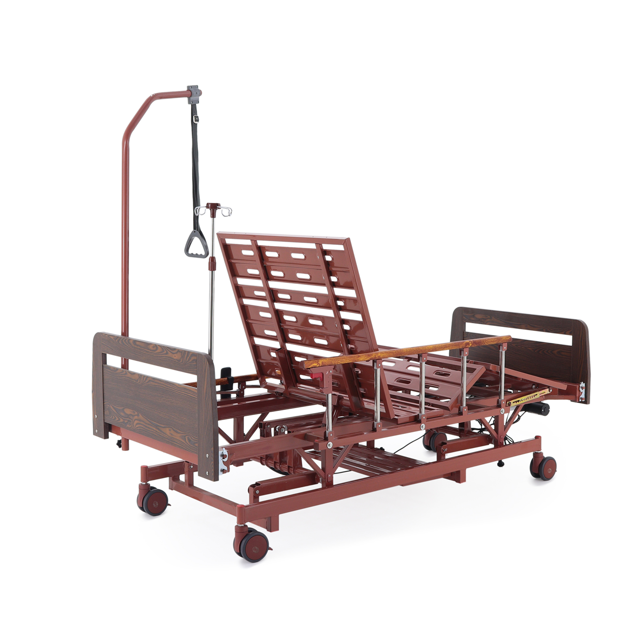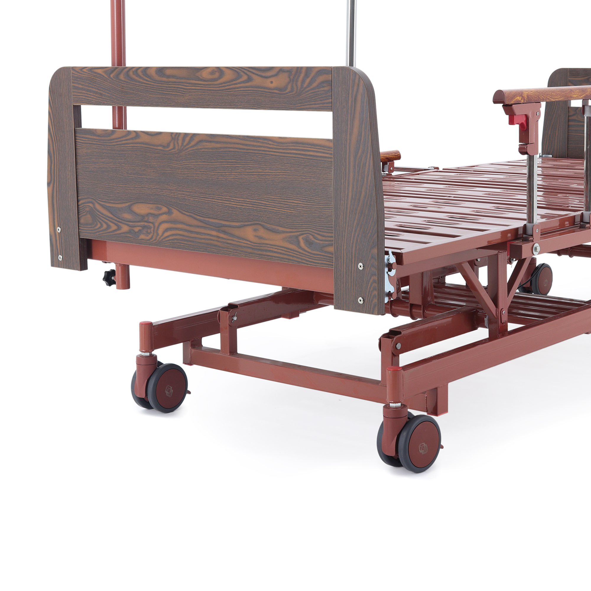 Практичный плюс для ухода: регулировка высоты ложа позволяет поднимать кровать для манипуляций и опускать для безопасной посадки/вставания, а складные ограждения помогают организовать защиту от случайного падения.